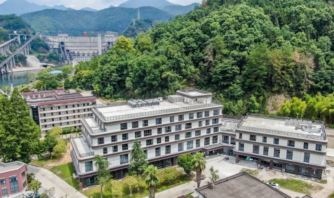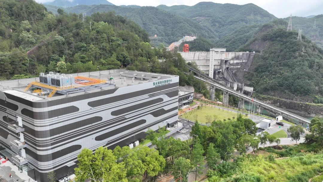 站在紧水滩水电站大坝往下游望去,右手侧的群山间,隐约可见一幢灰白相间现代风格建筑一角,这是即将投运的紧水滩绿色数据中心;再向正前方远眺,山腰往下明显的山体裸露,正是紧水滩抽水蓄能电站建设现场。