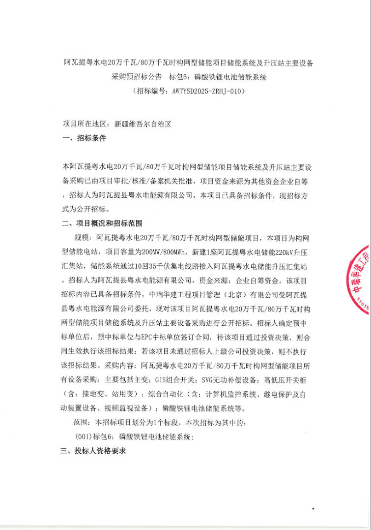 5月20日,阿瓦提粤水电20万千瓦/80万千瓦时构网型储能项目储能系统采购公告发布。采购200MW/800MWh构网型储能系统。