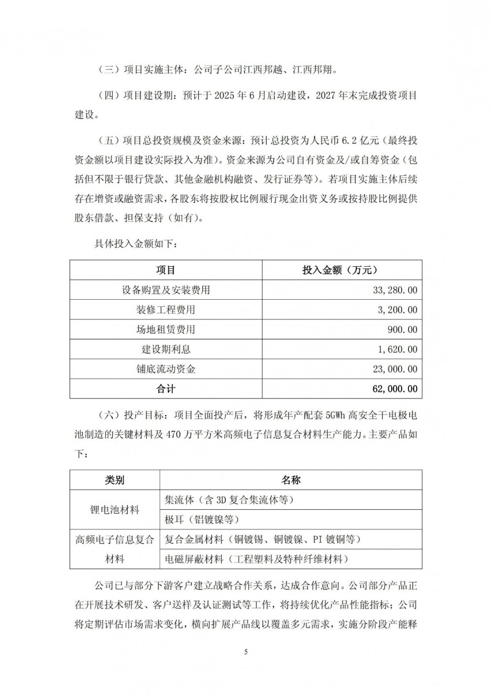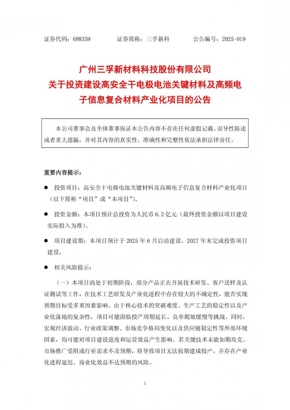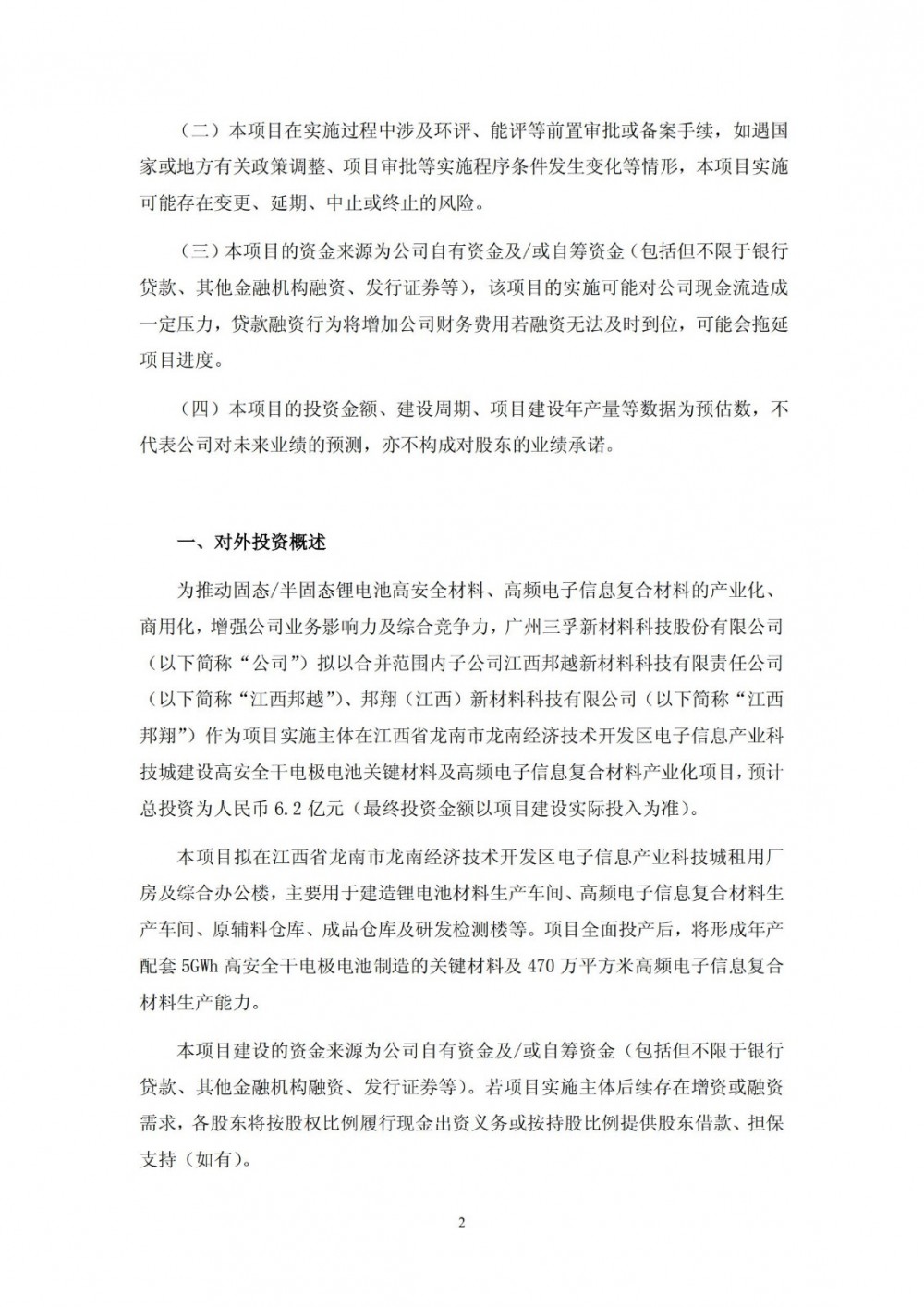 5月20日,三孚新科发布公告称,为推动固态/半固态锂电池高安全材料、高频电子信息复合材料的产业化、商用化,增强公司业务影响力及综合竞争力,广州三孚新材料科技股份有限公司拟以合并范围内子公司江西邦越新材料科技有限责任公司(以下简称“江西邦越”)、邦翔(江西)新材料科技有限公司作为项目实施主体在江西省龙南市龙南经济技术开发区电子信息产业科技城建设高安全干电极电池关键材料及高频电子信息复合材料产业化项目,预计总投资为人民币6.2亿元(最终投资金额以项目建设实际投入为准)。
