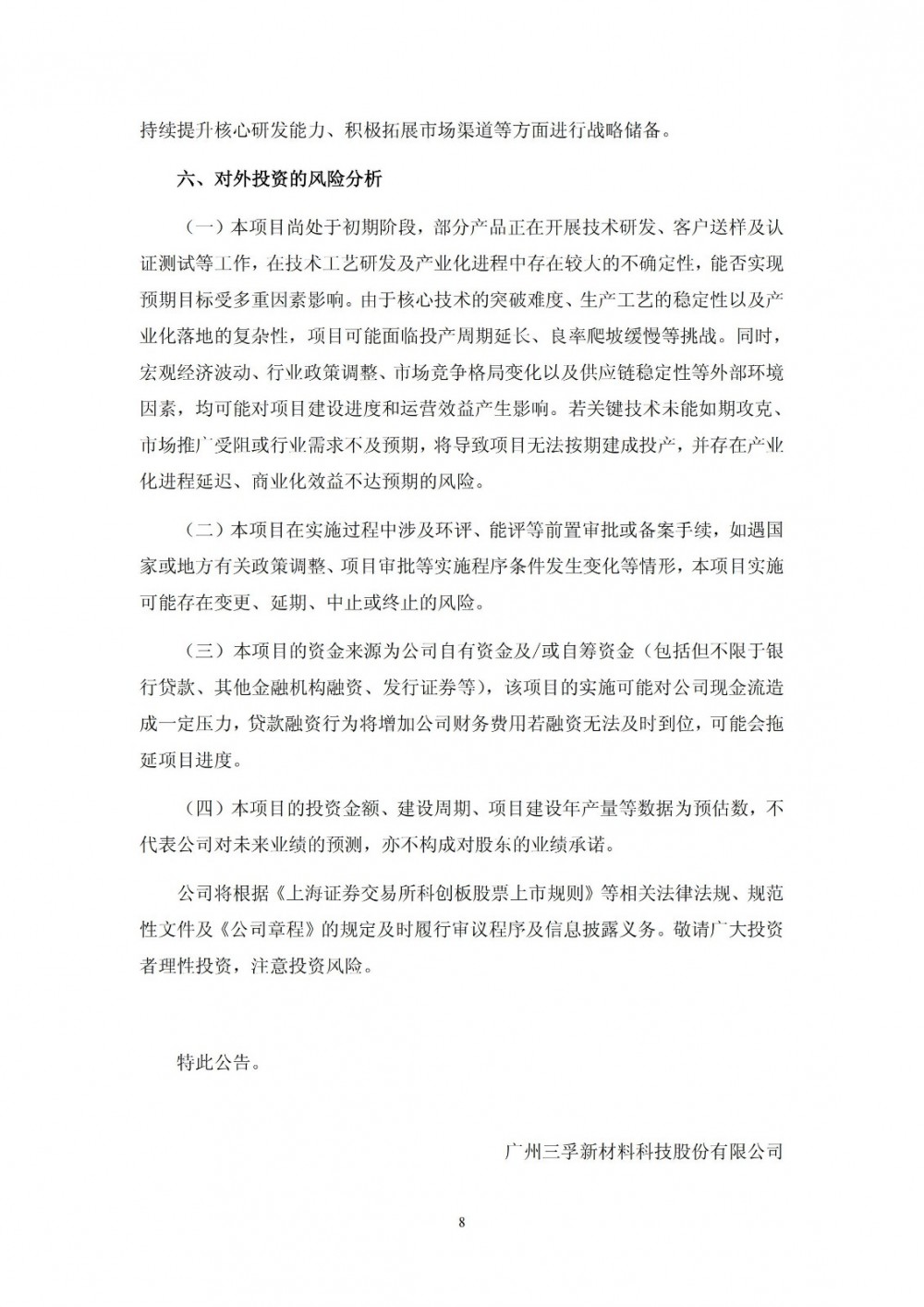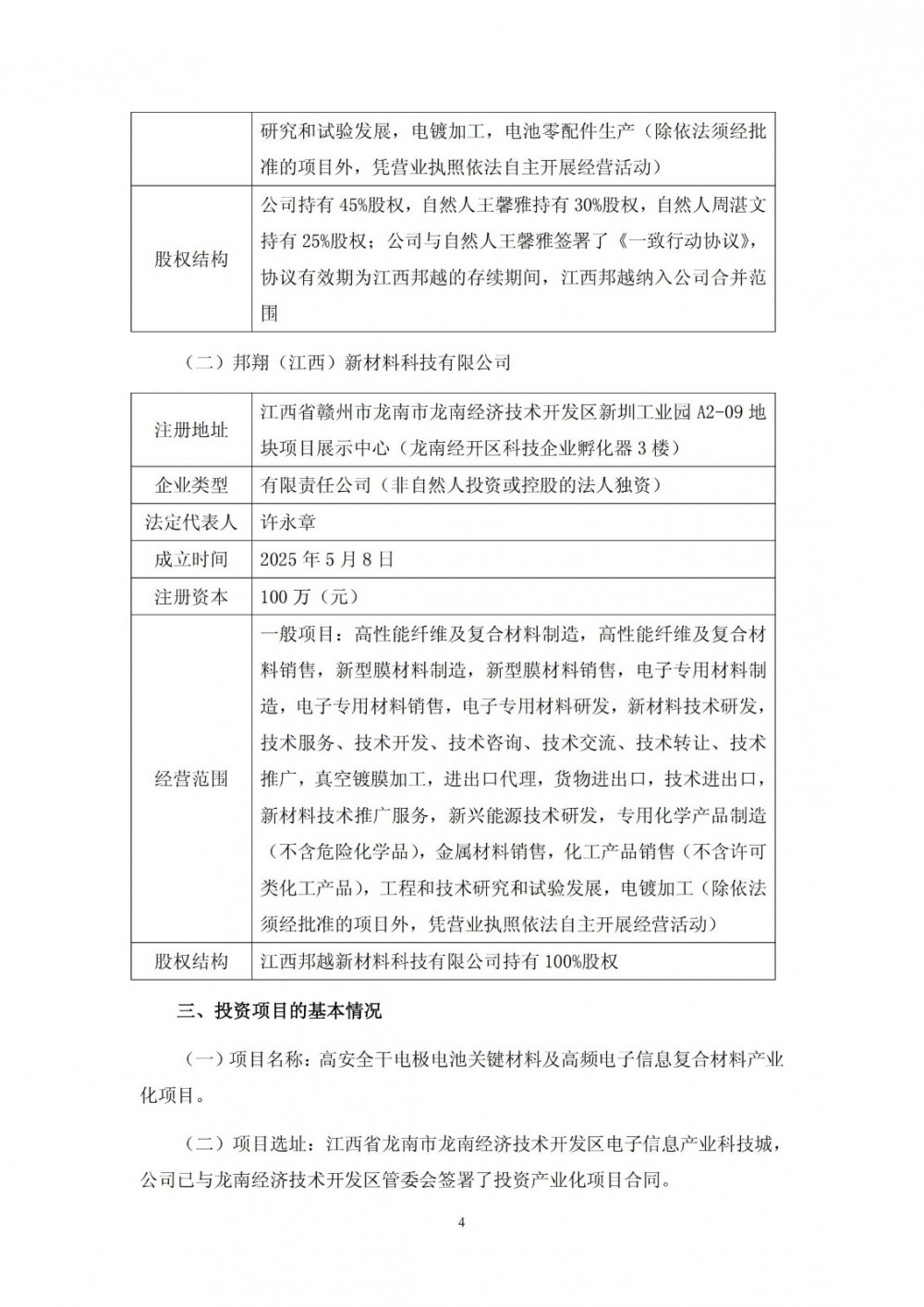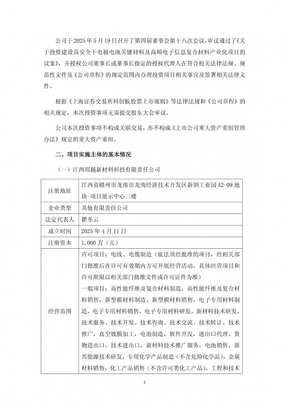 5月20日,三孚新科发布公告称,为推动固态/半固态锂电池高安全材料、高频电子信息复合材料的产业化、商用化,增强公司业务影响力及综合竞争力,广州三孚新材料科技股份有限公司拟以合并范围内子公司江西邦越新材料科技有限责任公司(以下简称“江西邦越”)、邦翔(江西)新材料科技有限公司作为项目实施主体在江西省龙南市龙南经济技术开发区电子信息产业科技城建设高安全干电极电池关键材料及高频电子信息复合材料产业化项目,预计总投资为人民币6.2亿元(最终投资金额以项目建设实际投入为准)。