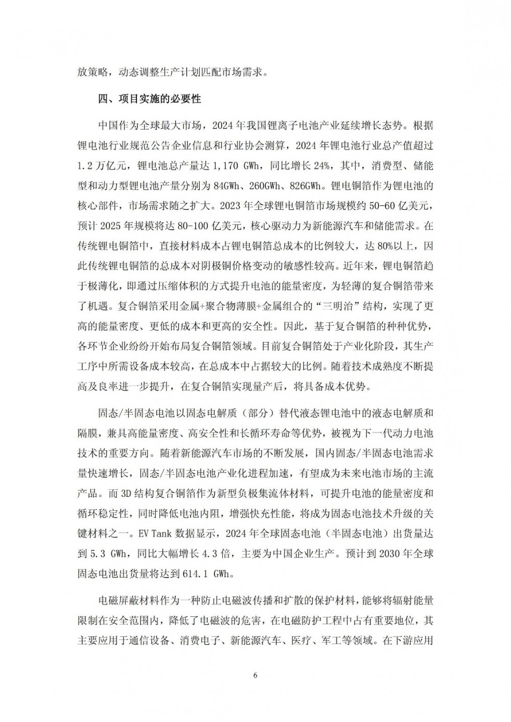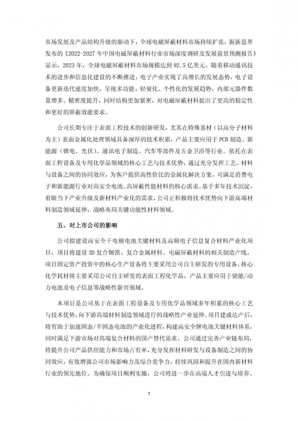 三孚新科表示,公司拟建设高安全干电极电池关键材料及高频电子信息复合材料产业化项目,项目将建设3D复合铜箔、复合金属材料、电磁屏蔽材料的相关制造产线,项目固定资产投资中的核心生产设备将主要采用公司自主研发的专用设备,核心化学耗材将主要采用公司自主研发的表面工程化学品,产品主要应用于储能/动力电池及电子信息等战略性新兴领域。