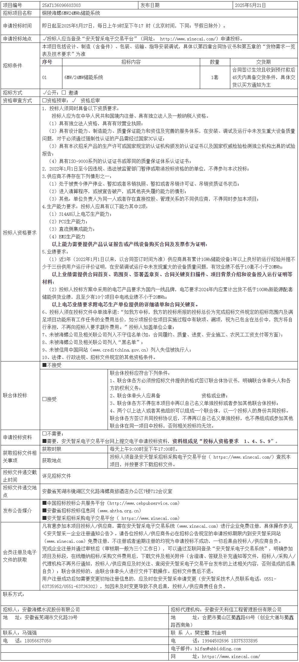 5月21日,铜陵海螺6MW24MWh储能系统招标公告。