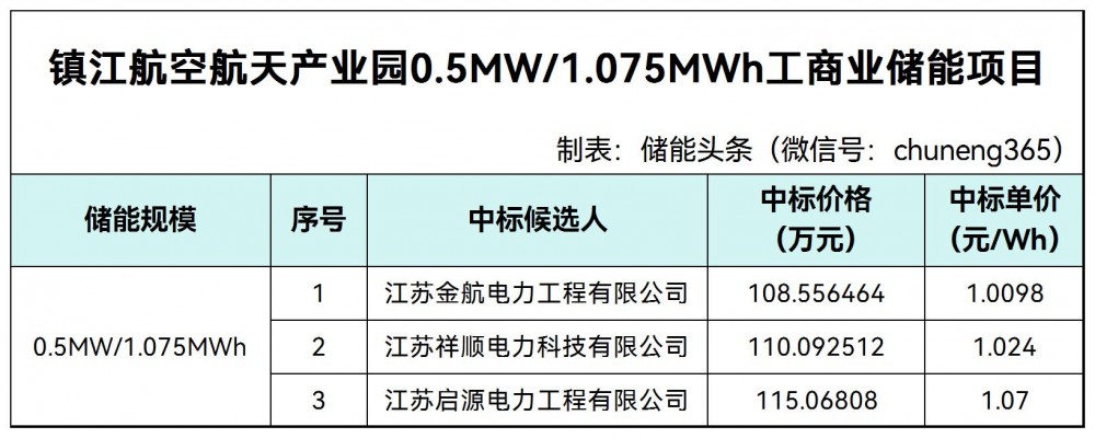 第一中标候选人为江苏金航电力工程有限公司,投标报价为108.556464万元,折合单价1.0098元/Wh;第二中标候选人为江苏祥顺电力科技有限公司,投标报价为110.092512万元,折合单价1.024元/Wh;第三中标候选人为江苏启源电力工程有限公司,投标报价为115.06808万元,折合单价1.07元/Wh。