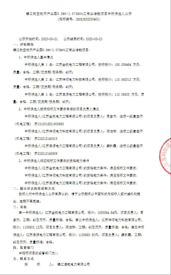 近日,镇江航空航天产业园0.5MW/1.075MWh工商业储能项目中标候选人公示。