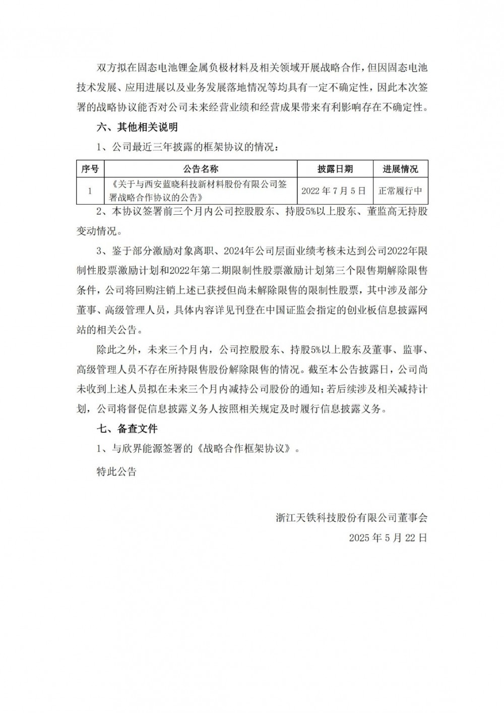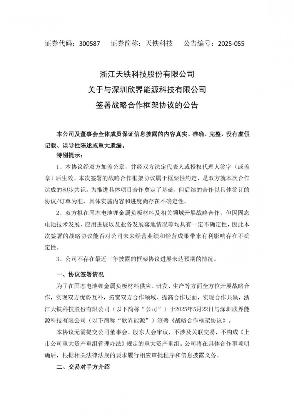 5月22日,天铁科技发布公告称,为了在固态电池锂金属负极材料供应、研发、生产等方面全方位开展战略合作,实现双方优势互补,拓宽双方合作领域、提高合作层面,实现合作共赢,公司与欣界能源签署《战略合作框架协议》。
