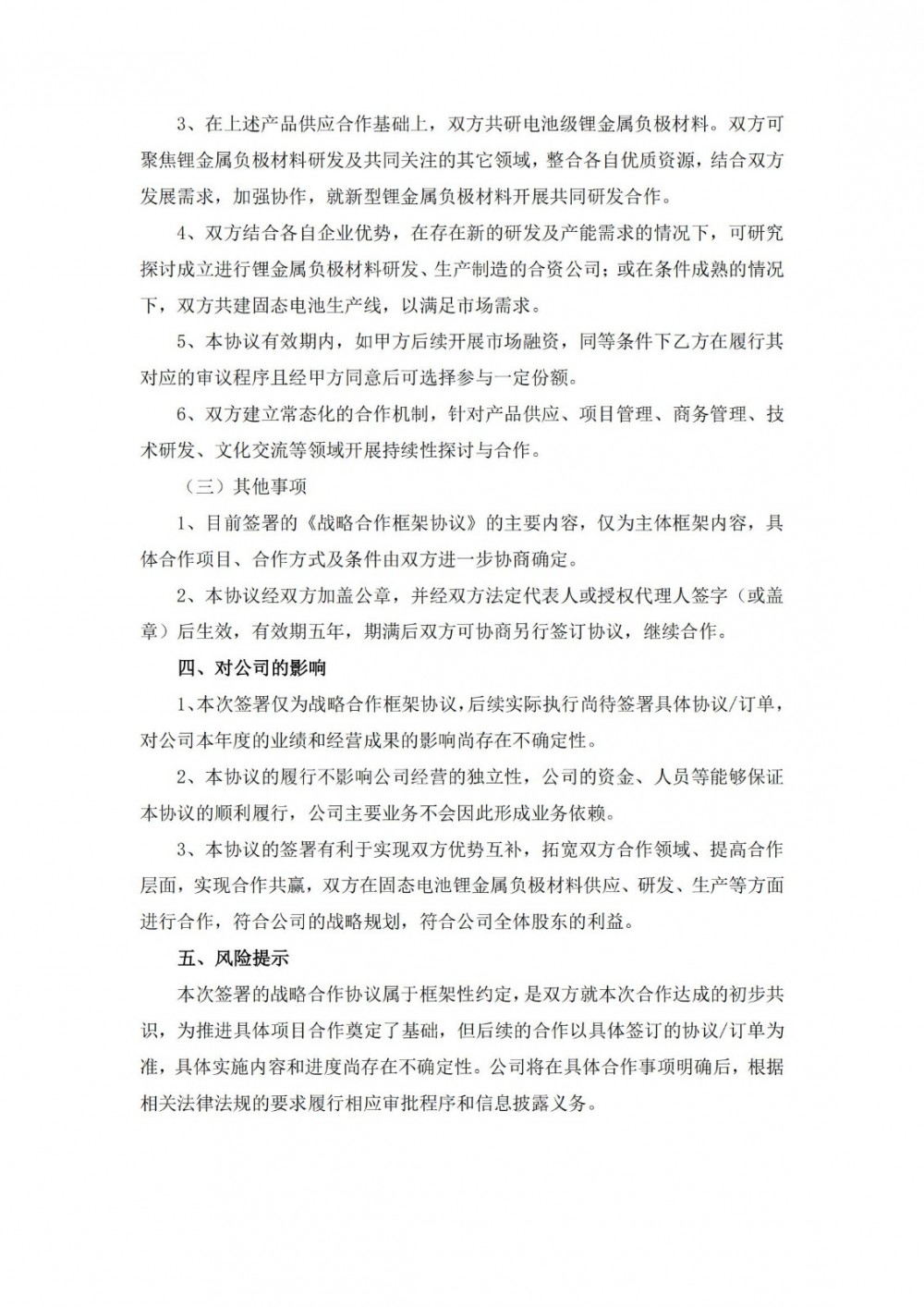 4、双方结合各自企业优势,在存在新的研发及产能需求的情况下,可研究探讨成立进行锂金属负极材料研发、生产制造的合资公司;或在条件成熟的情况下,双方共建固态电池生产线,以满足市场需求。