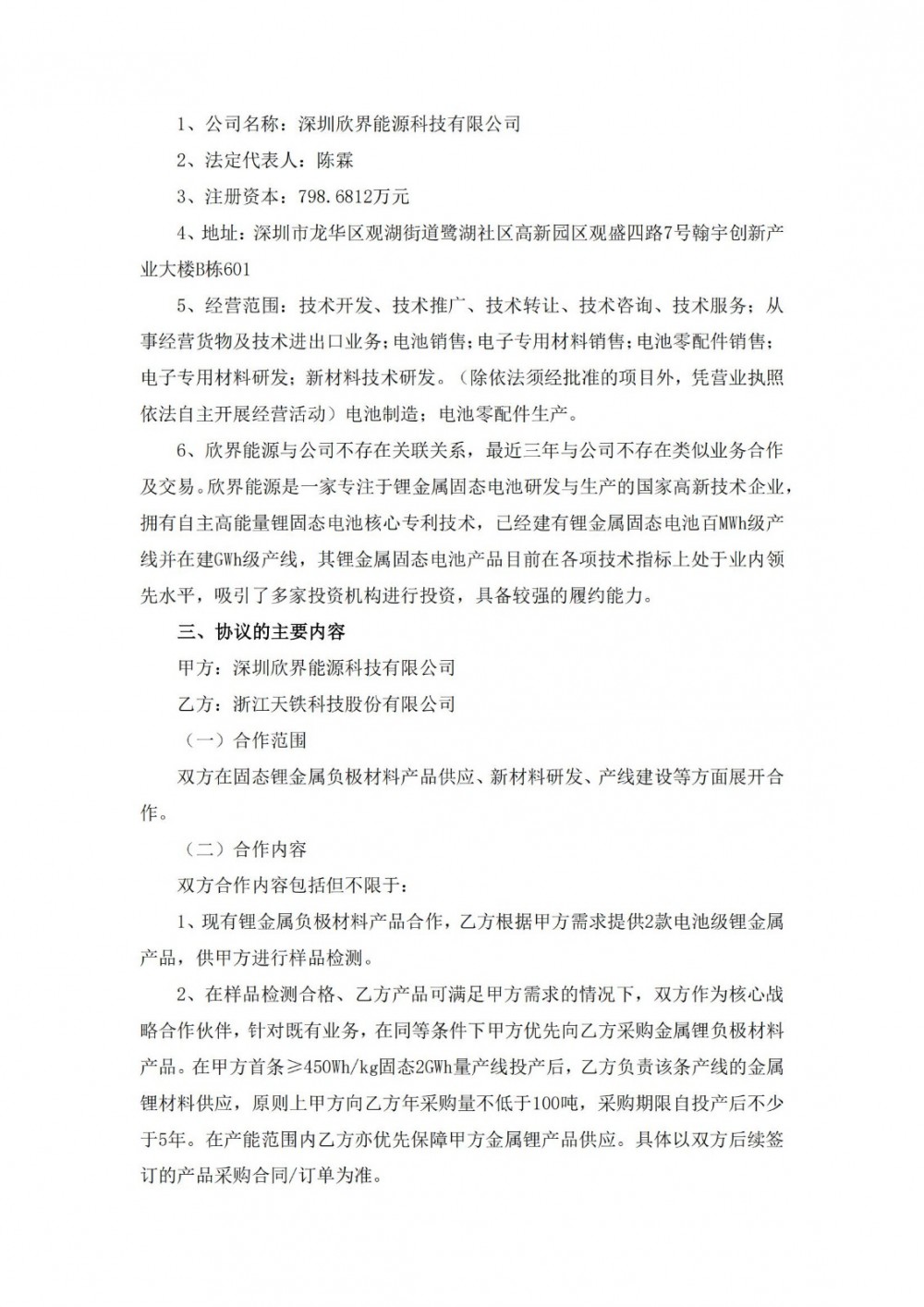 2、在样品检测合格、天铁科技产品可满足欣界能源需求的情况下,双方作为核心战略合作伙伴,针对既有业务,在同等条件下欣界能源优先向天铁科技采购金属锂负极材料产品。在欣界能源首条≥450Wh/kg固态2GWh量产线投产后,天铁科技负责该条产线的金属锂材料供应,原则上欣界能源向天铁科技年采购量不低于100吨,采购期限自投产后不少于5年。在产能范围内天铁科技亦优先保障欣界能源金属锂产品供应。具体以双方后续签订的产品采购合同/订单为准。
