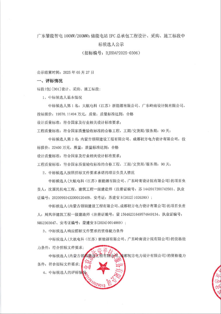 5月22日,广东肇能智电100MW/200MWh储能电站EPC总承包工程设计、采购、施工标段中标候选人公示。