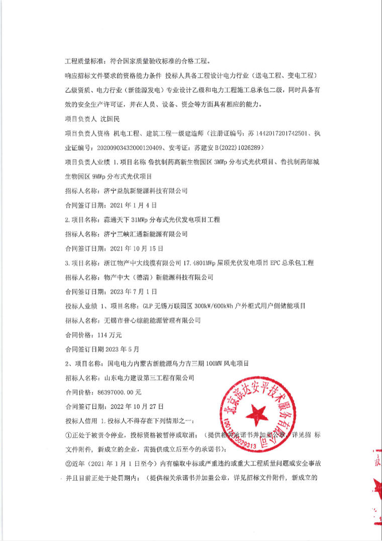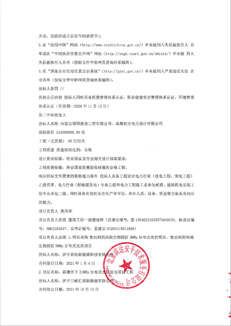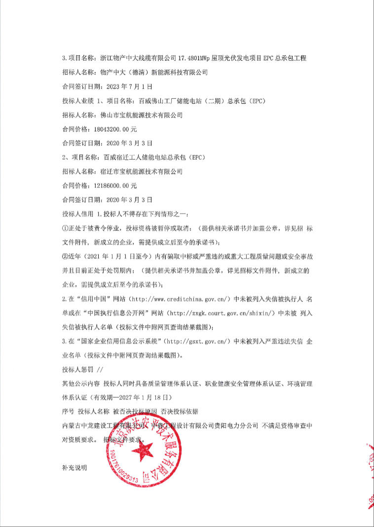 第一中标候选人为大航电科(江苏)新能源有限公司、广东岭南设计院有限公司,投标报价为19570.11494万元,折合单价0.979元/Wh;第二中标候选人为内蒙古领硕建设工程有限公司、成都初方电力设计有限公司,投标报价为22400万元,折合单价1.12元/Wh。