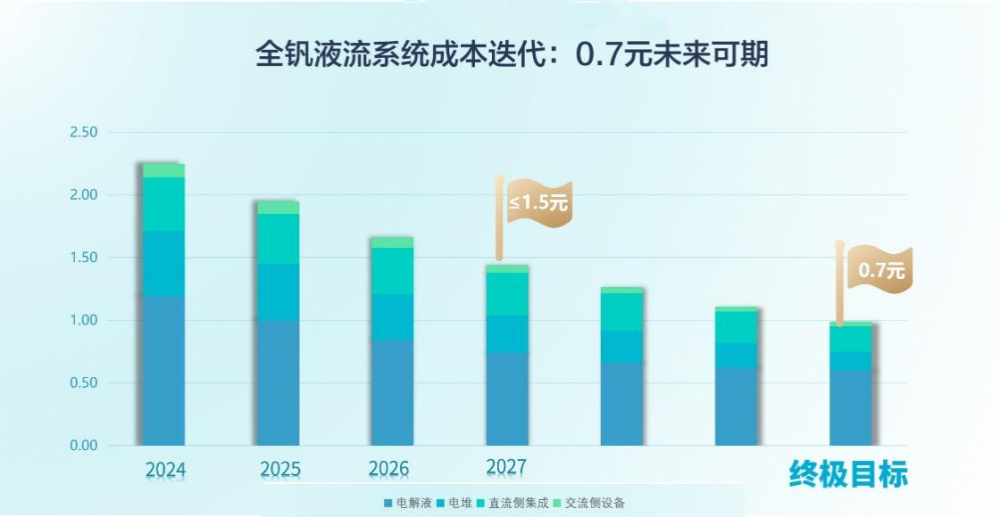 立足未来,随着材料体系持续优化、生产工艺迭代升级、产能规模快速扩张、供应链深度协同,全钒液流储能系统成本将突破1元/Wh临界点,并向0.7元/Wh的行业新标杆稳步迈进。这一进程不仅将重塑液流电池的经济性曲线,更将开启长时储能大规模商业化的新纪元。