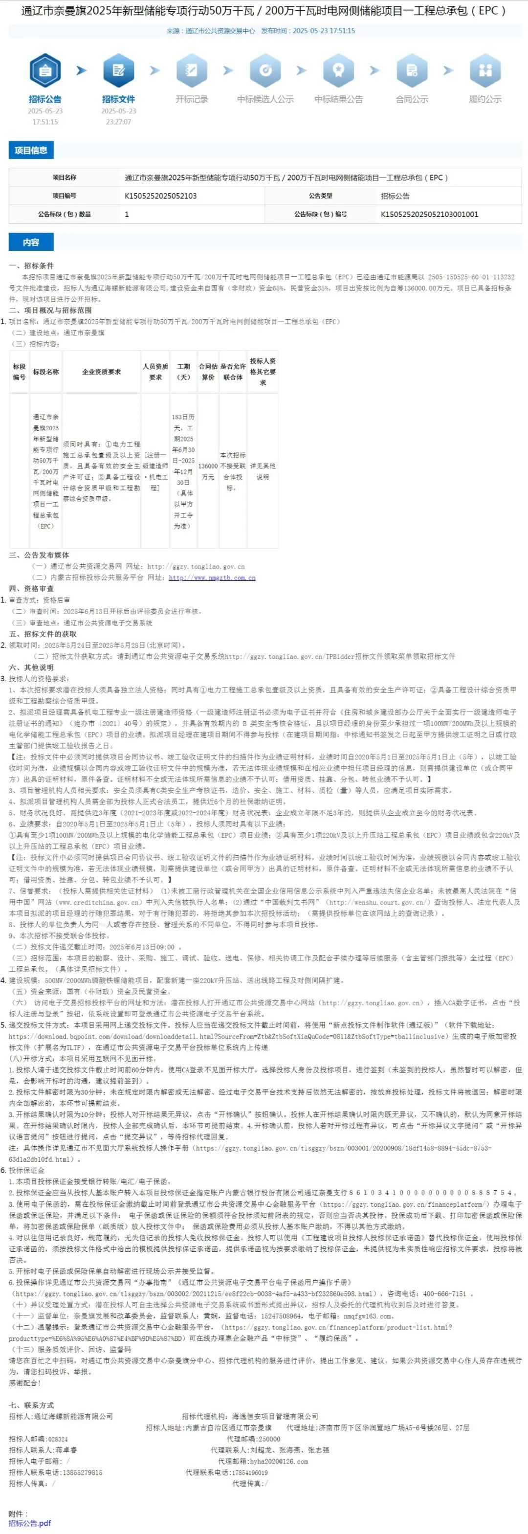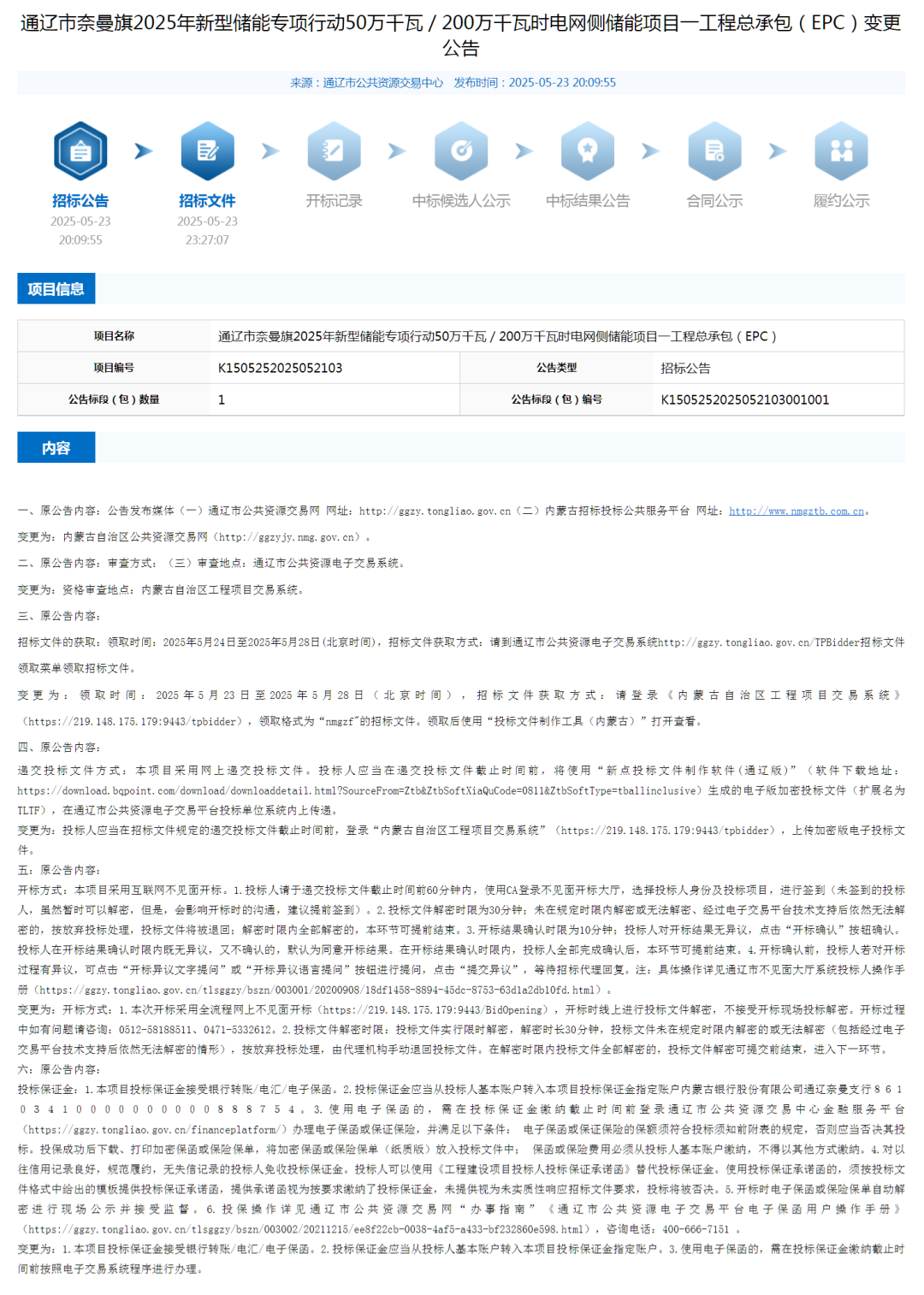 获悉,5月23日,通辽市奈曼旗2025年新型储能专项行动50万千瓦/200万千瓦时电网侧储能项目一工程总承包(EPC)招标公告发布。