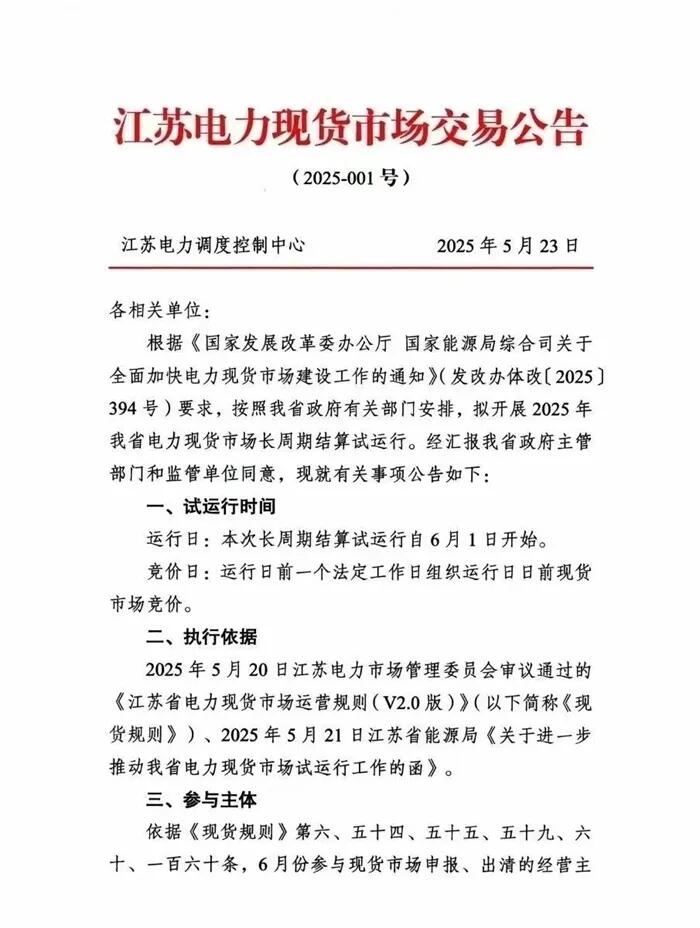 5月23日,江苏电力调度控制中心下发江苏电力现货市场交易公告。其表示,根据《国家发展改革委办公厅国家能源局综合司关于全面加快电力现货市场建设工作的通知》发改办体改[2025394号)要求,按照江苏省政府有关部门安排,拟开展2025年江苏省电力现货市场长周期结算试运行。其中,