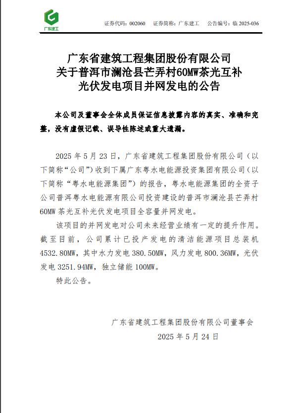 5月23日,广东建工发布公告称,截至目前,公司累计已投产发电的清洁能源项目总装机4532.80MW,其中水力发电380.50MW,风力发电800.36MW,光伏发电3251.94MW,独立储能100MW。