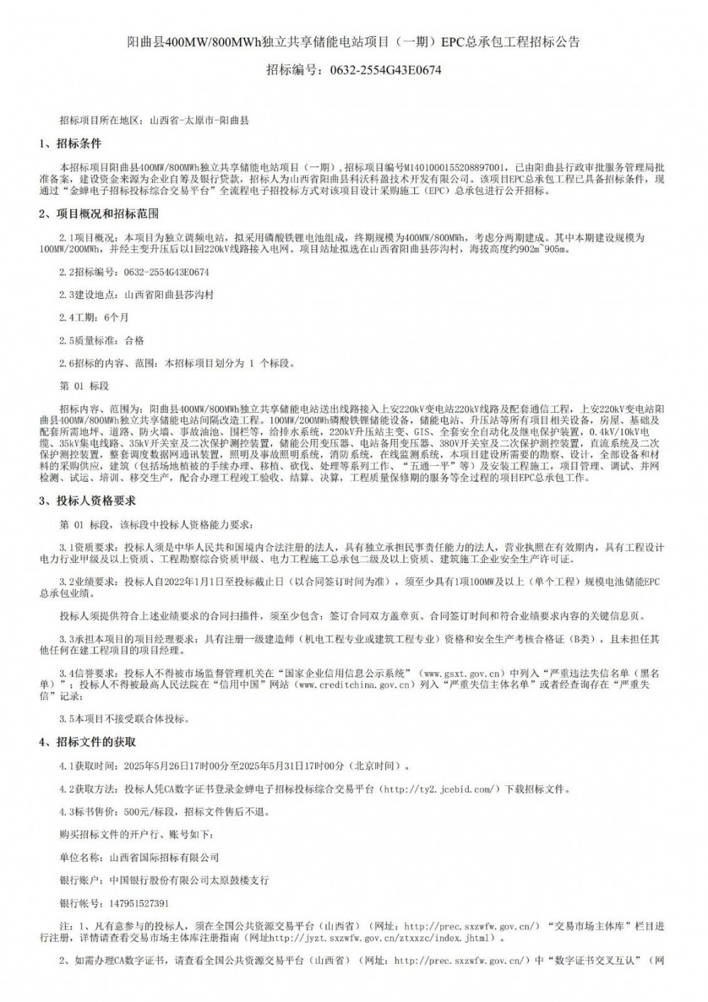 5月26日,阳曲县400MW/800MWh独立共享储能电站项目(一期)EPC总承包工程招标公告发布。