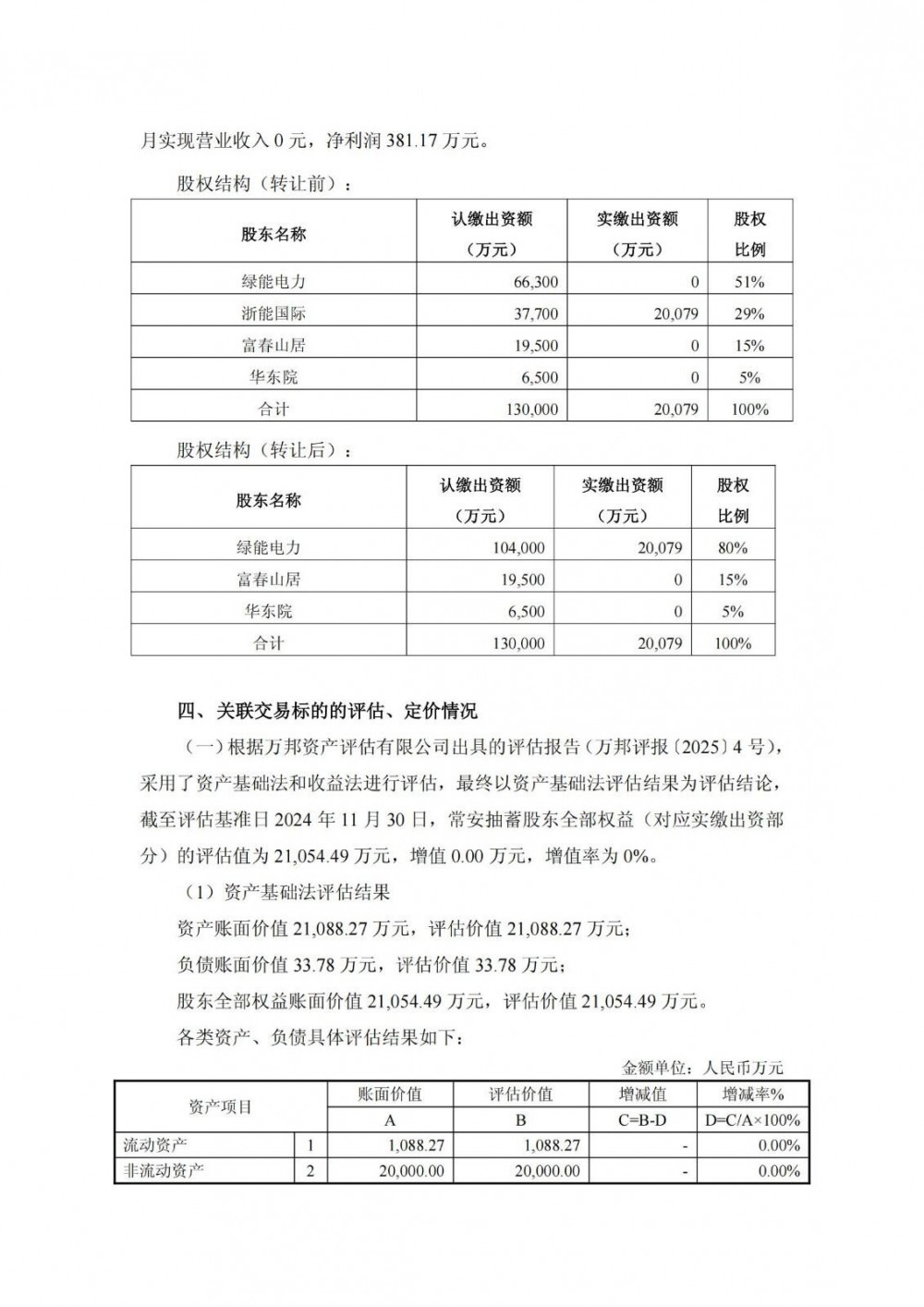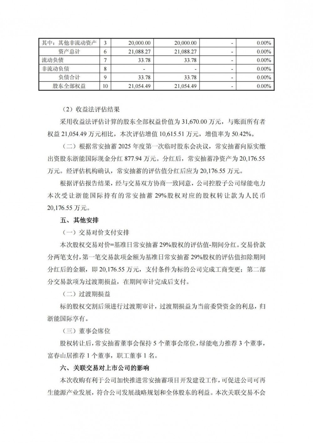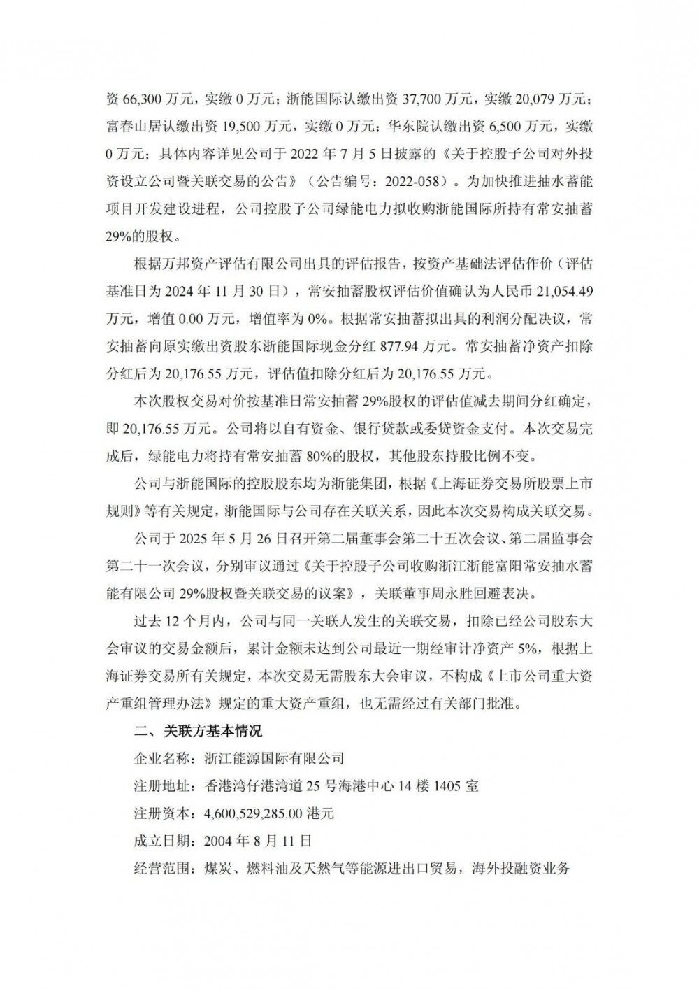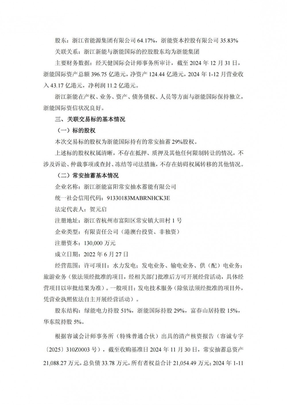常安抽蓄由公司控股子公司绿能电力、浙能国际、杭州富春山居集团有限公司、中国电建集团华东勘测设计研究院有限公司按51%、29%、15%、5%的股比共同设立,其中绿能电力认缴出资66,300万元,实缴0万元;浙能国际认缴出资37,700万元,实缴20,079万元;富春山居认缴出资19,500万元,实缴0万元;华东院认缴出资6,500万元,实缴0万元。为加快推进抽水蓄能项目开发建设进程,公司控股子公司绿能电力拟收购浙能国际所持有常安抽蓄29%的股权。
