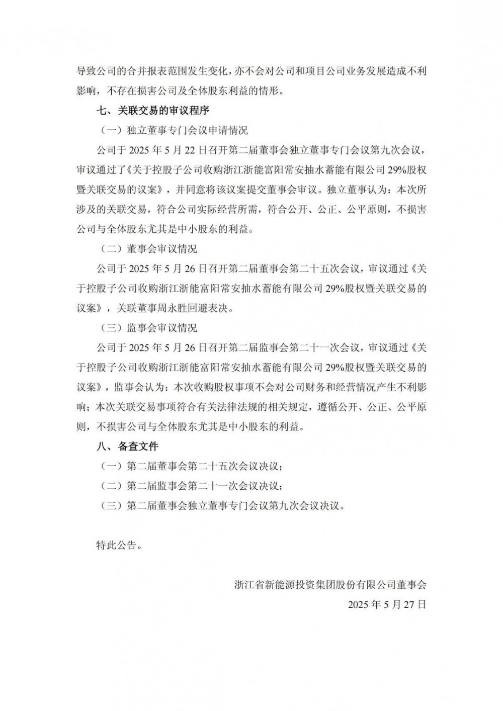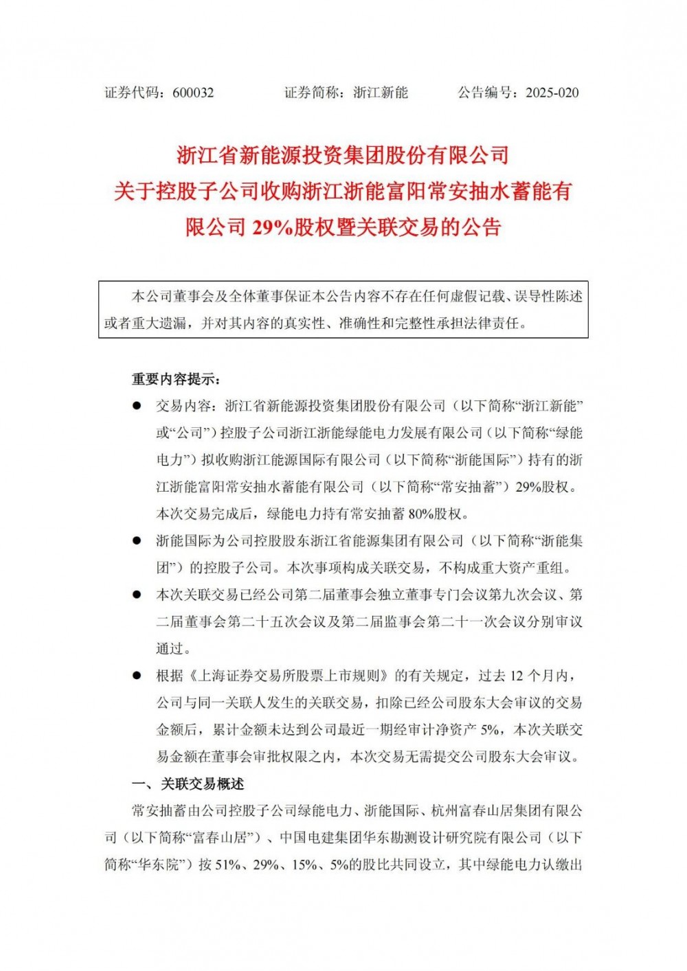 5月26日,浙江新能发布公告称,公司控股子公司浙江浙能绿能电力发展有限公司拟收购浙江能源国际有限公司持有的浙江浙能富阳常安抽水蓄能有限公司29%股权。本次交易完成后,绿能电力持有常安抽蓄80%股权。