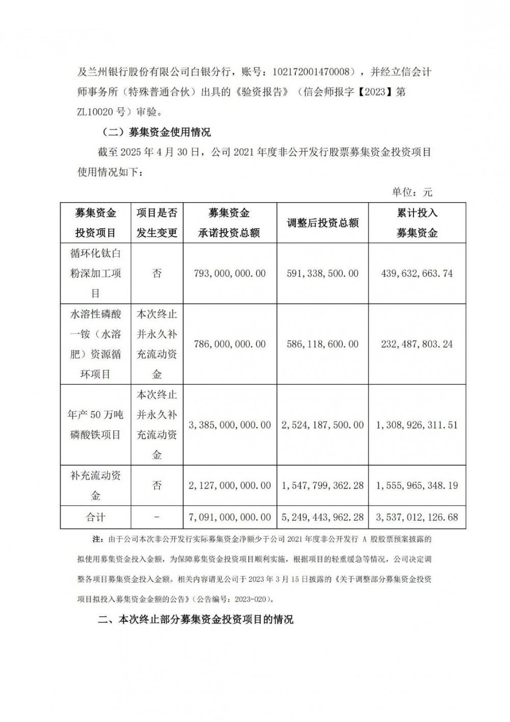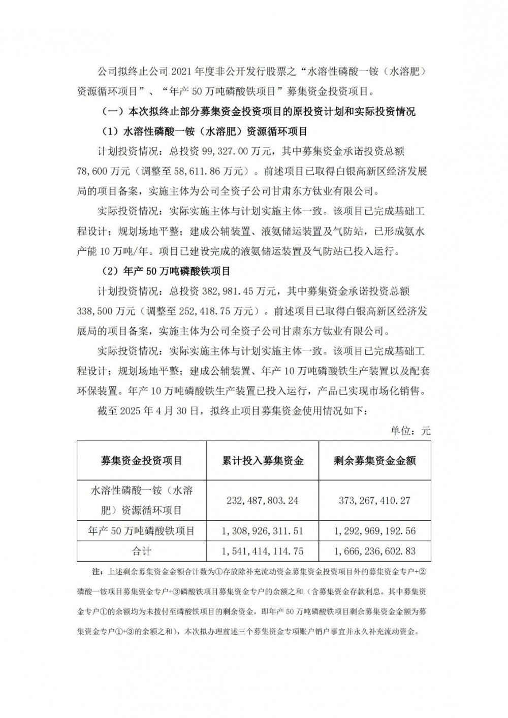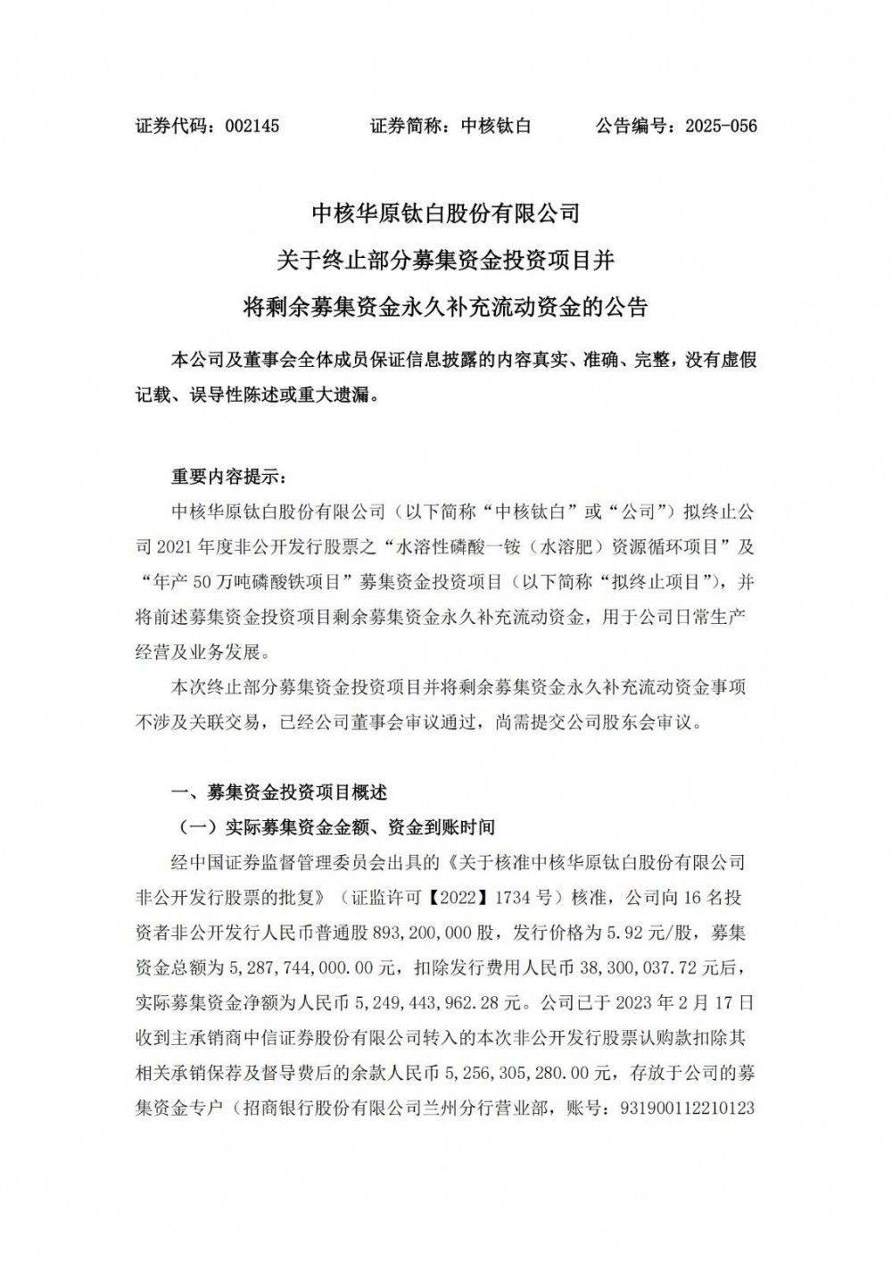 近日,中核钛白发布公告称,公司拟终止公司2021年度非公开发行股票之“水溶性磷酸一铵(水溶肥)资源循环项目”及“年产50万吨磷酸铁项目”募集资金投资项目,并将前述募集资金投资项目剩余募集资金永久补充流动资金,用于公司日常生产经营及业务发展。