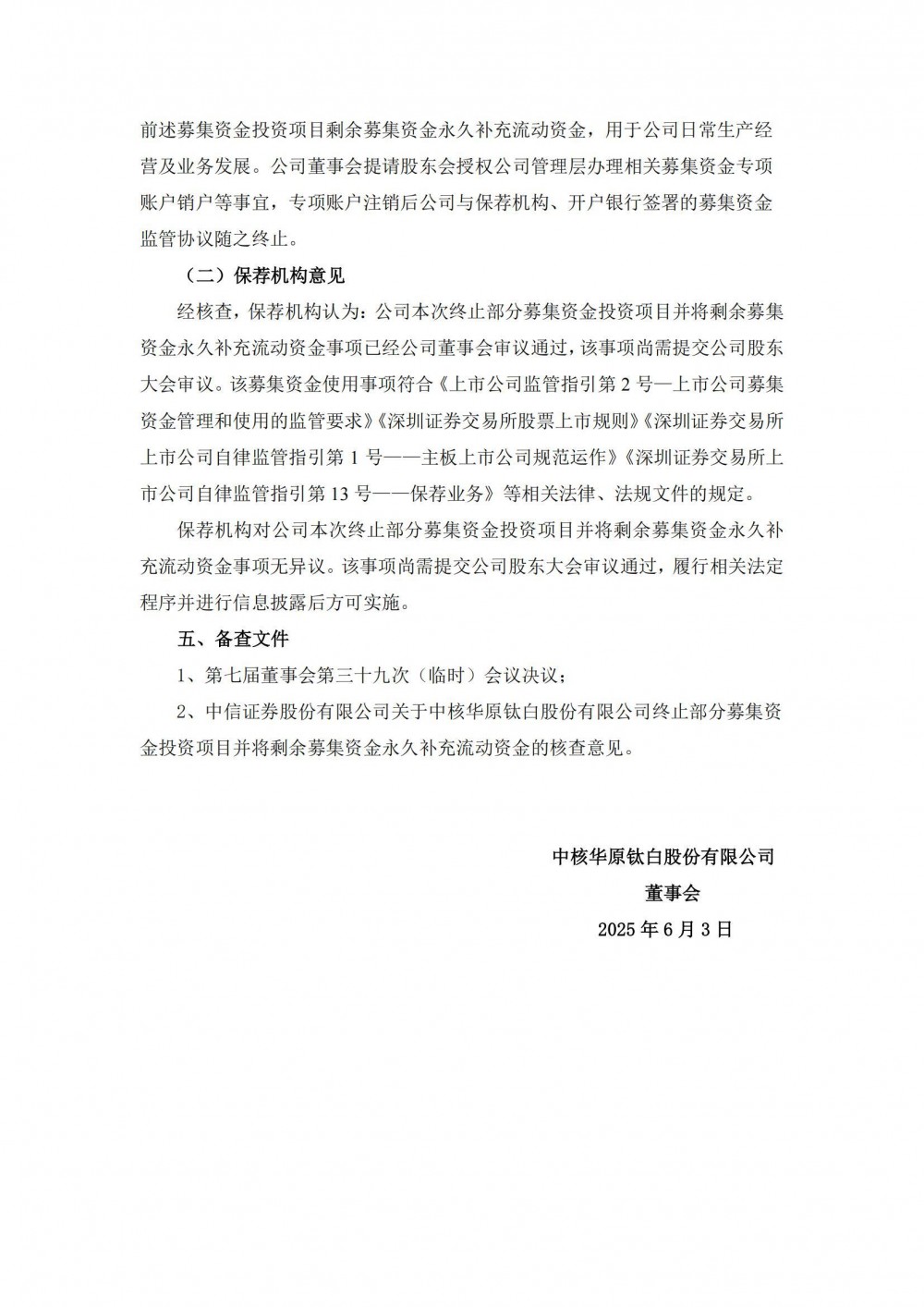 本次终止部分募集资金投资项目并将剩余募集资金永久补充流动资金事项不涉及关联交易,已经中核钛白董事会审议通过,尚需提交公司股东会审议。