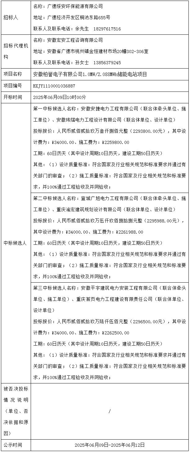 6月9日,安徽柏誉电子有限公司1.0MW/2.088MWh储能电站项目中标候选人公示。