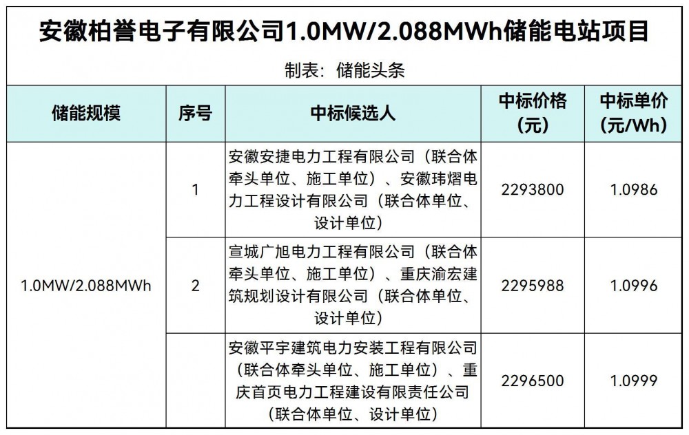 第一中标候选人为安徽安捷电力工程有限公司(联合体牵头单位、施工单位)、安徽玮熠电力工程设计有限公司(联合体单位、设计单位),投标报价为2293800元,折合单价1.0986元/Wh;第二中标候选人为宣城广旭电力工程有限公司(联合体牵头单位、施工单位)、重庆渝宏建筑规划设计有限公司(联合体单位、设计单位),投标报价为2295988元,折合单价1.0996元/Wh;第三中标候选人为安徽平宇建筑电力安装工程有限公司(联合体牵头单位、施工单位)、重庆首页电力工程建设有限责任公司(联合体单位、设计单位),投标报价为2296500元,折合单价1.0999元/Wh。