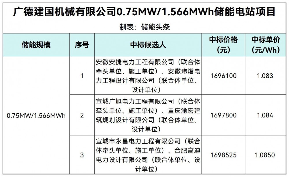 第一中标候选人为安徽安捷电力工程有限公司(联合体牵头单位、施工单位)、安徽玮熠电力工程设计有限公司(联合体单位、设计单位),投标报价为1696100元,折合单价1.083元/Wh;第二中标候选人为宣城广旭电力工程有限公司(联合体牵头单位、施工单位)、重庆渝宏建筑规划设计有限公司(联合体单位、设计单位),投标报价为1697800元,折合单价1.084元/Wh;第三中标候选人为宣城市永昌电力工程有限公司(联合体牵头单位、施工单位)、合肥高迪电力设计有限公司(联合体单位、设计单位),投标报价为1698525元,折合单价1.085元/Wh。