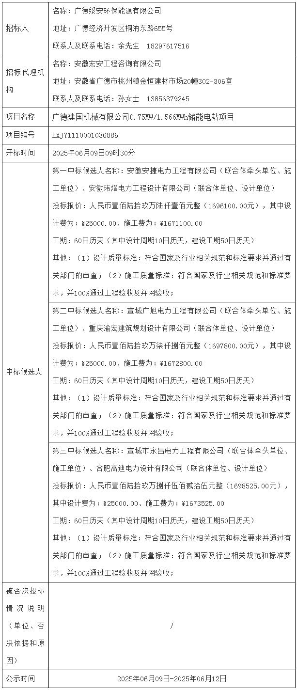 6月9日,广德建国机械有限公司0.75MW/1.566MWh储能电站项目中标候选人公示。