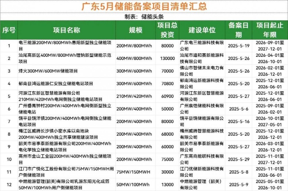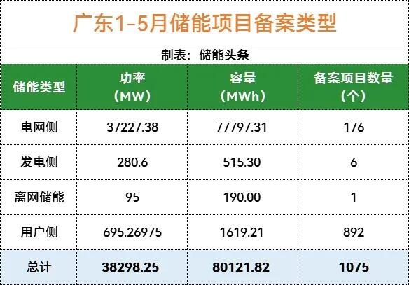 储能头条据公开数据不完全统计,2025年1-5月广东(包括深圳)共完成储能项目备案1075个,投资金额1203.08亿元,备案储能规模38.298GW/80.12GWh。