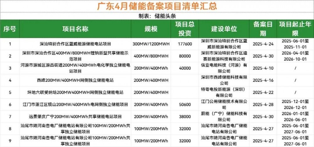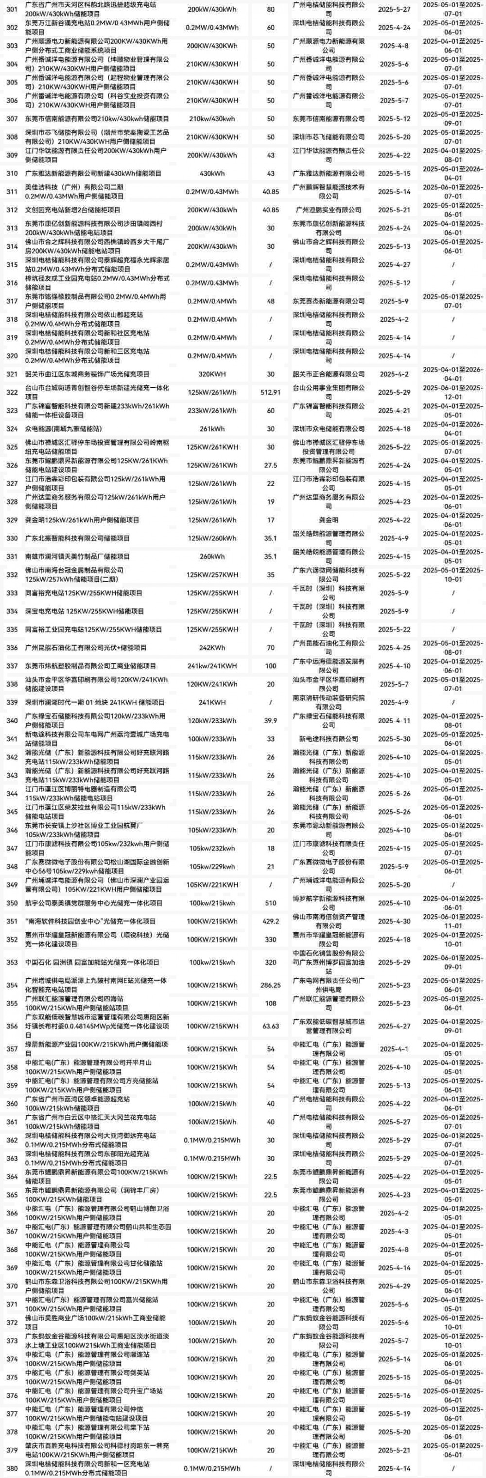 4月广东备案9个百兆瓦级储能项目,其中多数为电网侧储能,有共享储能、独立储能等,以及少部分发电侧储能。