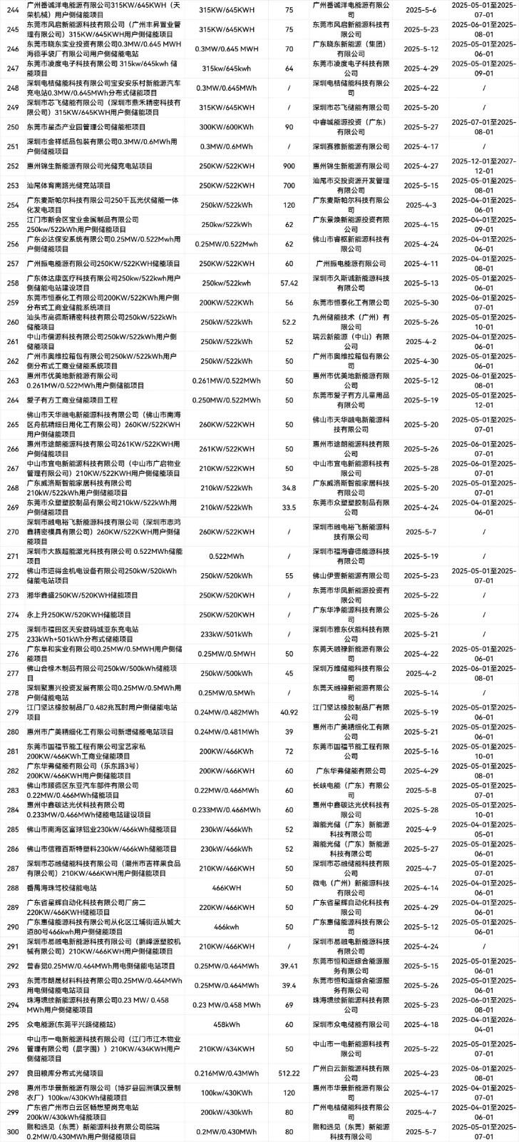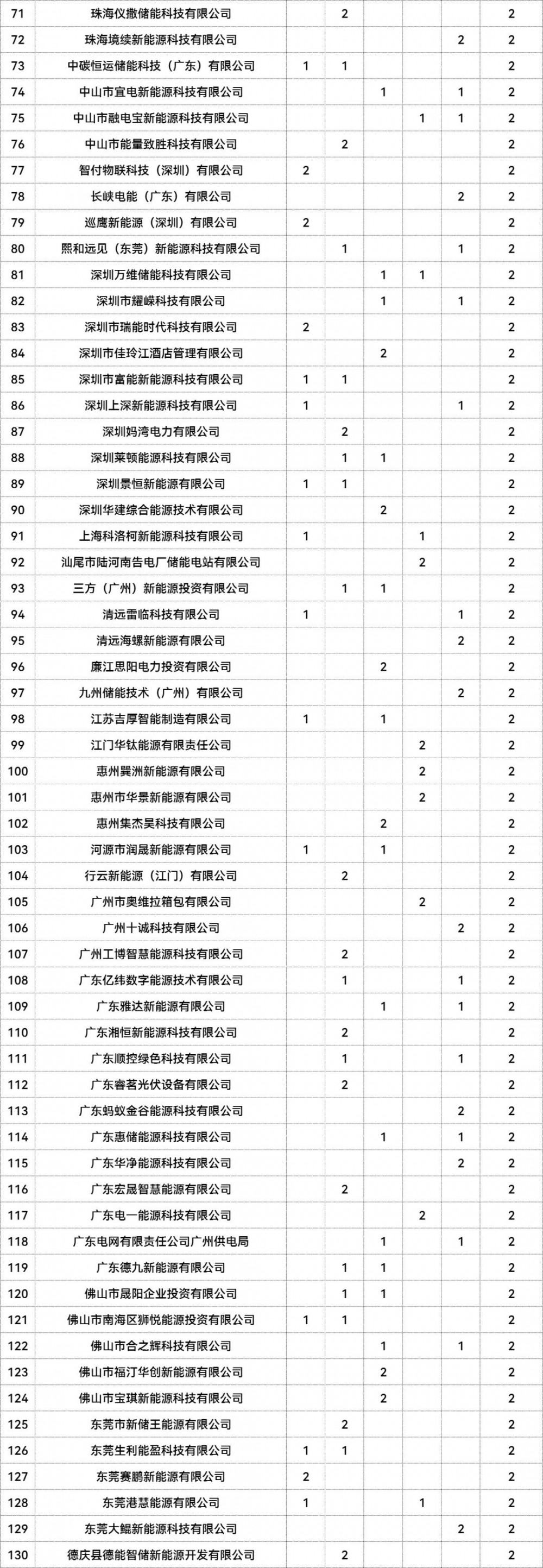 此外,东莞天融禄新能源有限公司、东莞市新有能源投资有限公司、深圳市芯融储能科技有限公司、广州电桔储能科技有限公司、中山市综合能源服务有限公司、微电(广州)新能源科技有限公司、广州汇能电力科技有限公司均备案10个项目以上。