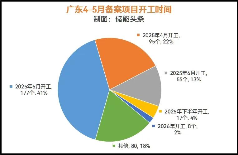 据公开的信息显示,广东4-5月完成备案的储能项目,开工时间多数为5月份,数量占到41%,4月开工的占22%,6月开工占13%。