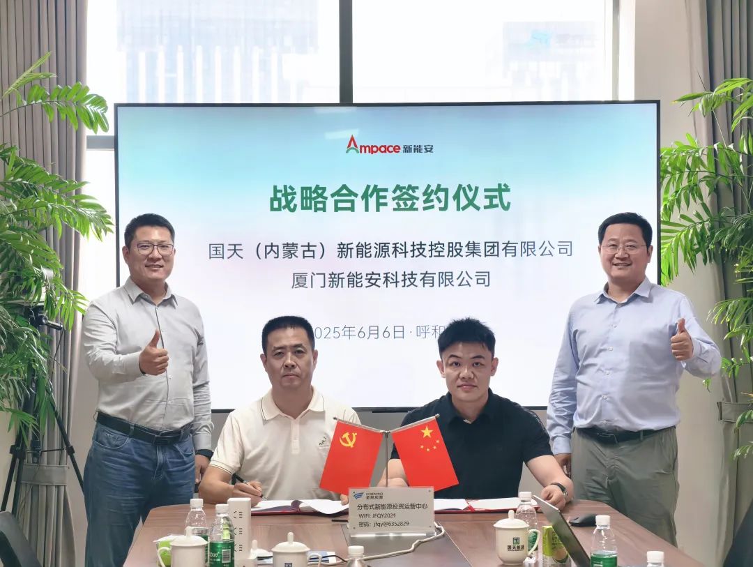 近日,厦门新能安科技有限公司(以下简称“新能安”)与内蒙古新能源领军企业——国天(内蒙古)新能源科技控股集团有限公司(以下简称“国天能源”)正式签署战略合作协议。此次强强联合,标志着新能安在推动绿色能源转型、深化储能市场布局方面迈出坚实一步。双方将充分发挥各自优势,共同开发内蒙古、河北等区域储能市场,合力打造零碳园区与虚拟电厂运营标杆,为中国“双碳”目标的实现贡献创新力量。