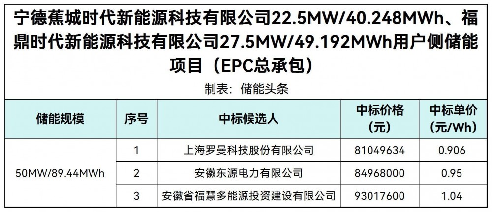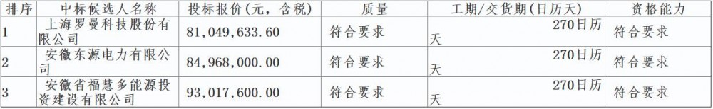 第一中标候选人为上海罗曼科技股份有限公司,投标报价81049633.6元,折合单价0.906元/Wh;第二中标候选人为安徽东源电力有限公司,投标报价84968000元,折合单价0.95元/Wh;第三中标候选人为安徽省福慧多能源投资建设有限公司,投标报价93017600元,折合单价1.040元/Wh。