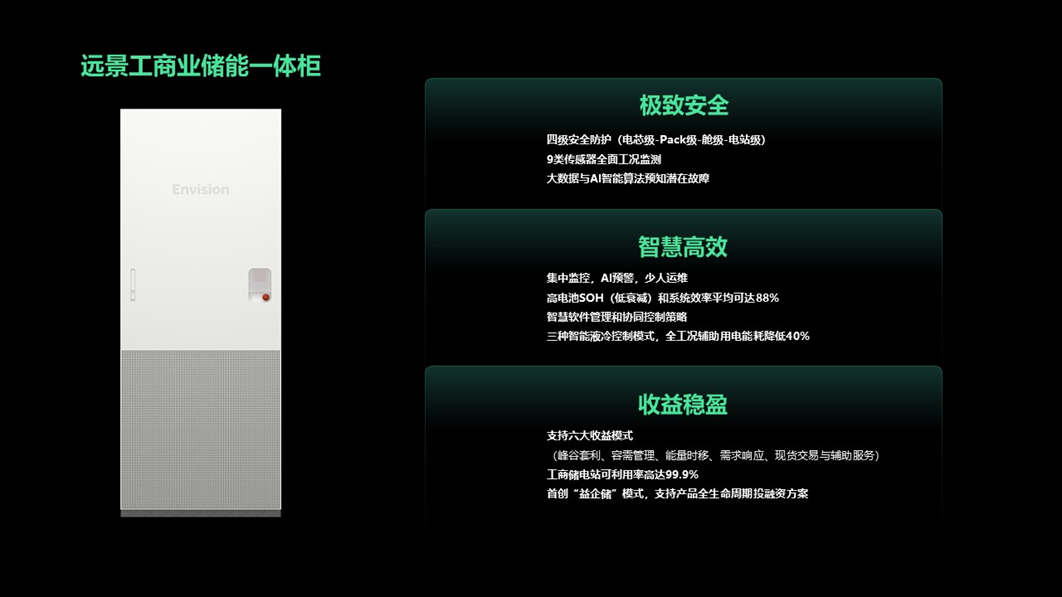 远景工商储产品致力于实现“技术全栈化、收益智能化、场景融合化”,以“产品+交易+服务”三位一体模式,打造实现“收益稳盈”的工商储产品。