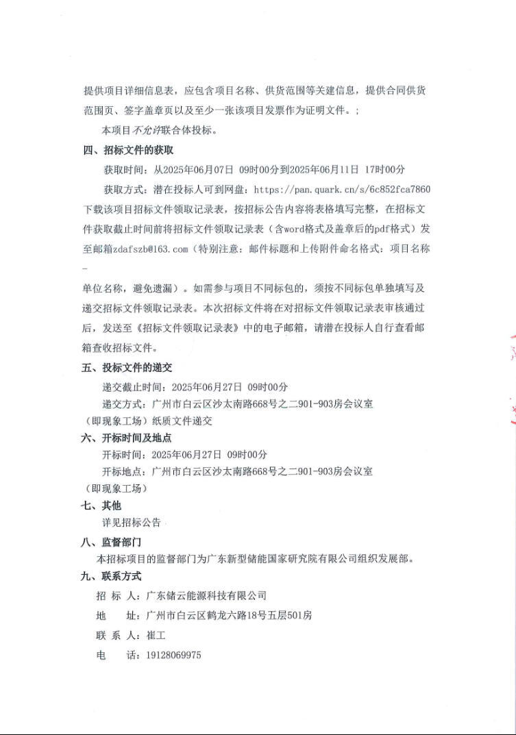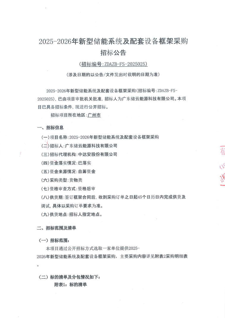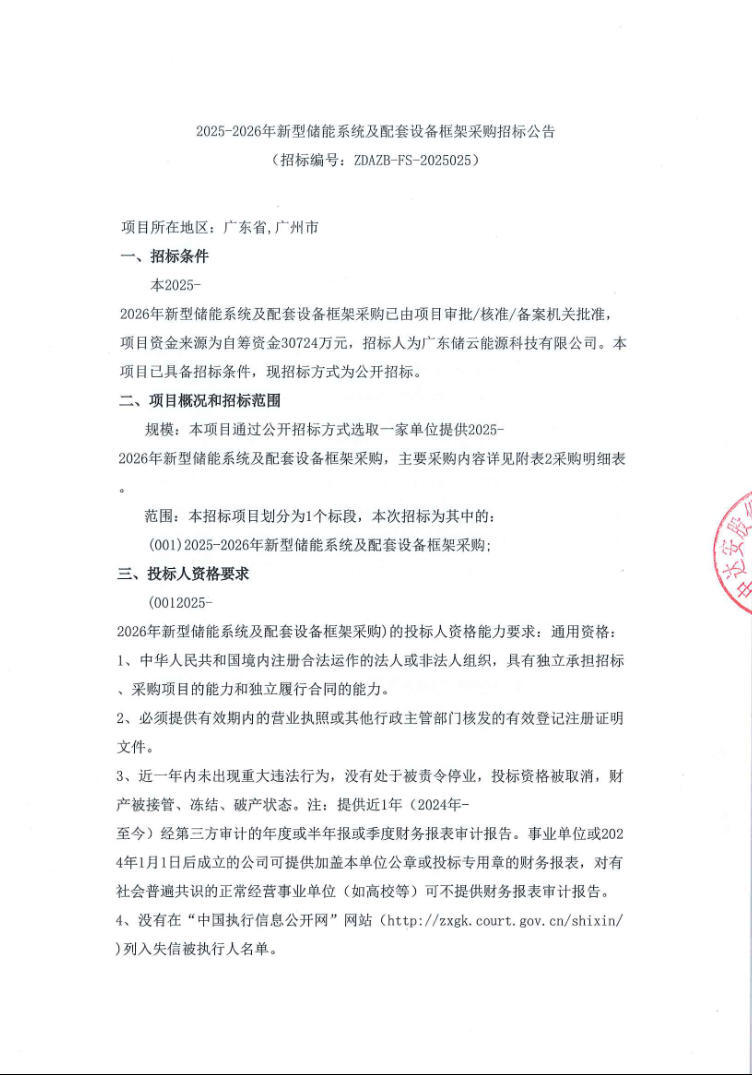 6月6日,广东新型储能国家研究院有限公司全资子公司广东储云能源科技有限公司启动2025-2026年新型储能系统及配套设备框架采购。