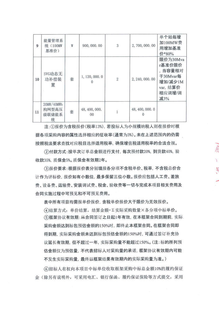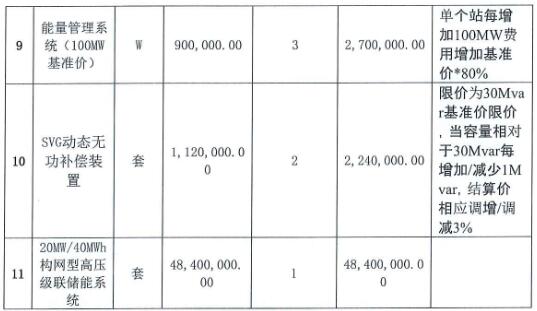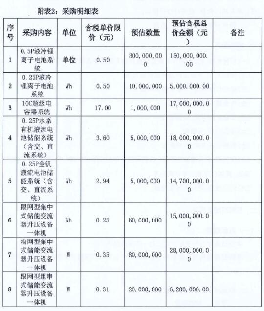 招标采购明细表显示,该项目框采产品包括0.5P锂离子电池系统300MWh(限价0.5元/Wh)、0.25P液冷锂离子电池系统10MWh(限价0.5元/Wh)、10C超级电容系统1MW(限价17元/Wh)、0.25P水系有机液流电池储能系统5MWh(限价3.6元/Wh)、0.25P全钒液流电池储能系统5MWh(限价2.94元/Wh)、跟网型集中式储能变流器升压设备一体机60W(限价0.25元/W)、构网型集中式储能变流器升压设备一体机80W(限价0.35元/W)、跟网型组串式储能变流器升压设备一体机20W(限价0.31元/W)、能量管理系统3套、SVG动态无功补偿装置2套、20MW/40MWh构网型高压级联储能系统。