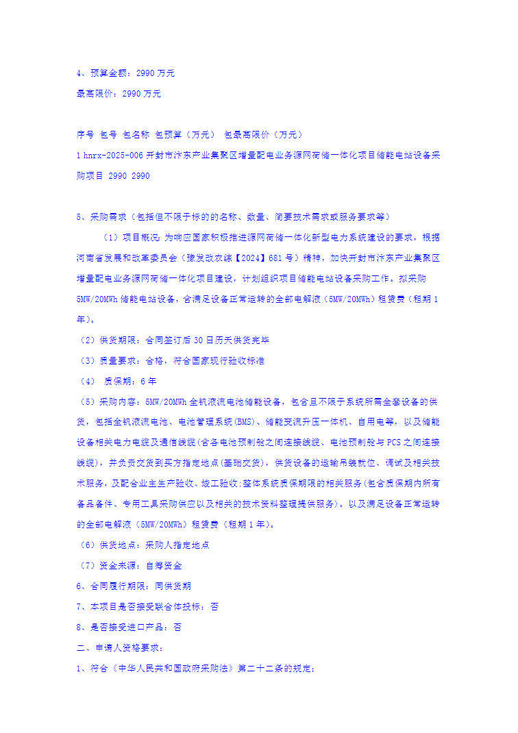 采购内容为5MW/20MWh全钒液流电池储能设备,包含且不限于系统所需全套设备的供货,包括全钒液流电池、电池管理系统(BMS)、储能变流升压一体机、自用电等,以及储能设备相关电力电缆及通信线缆(含各电池预制舱之间连接线缆、电池预制舱与 PCS 之间连接线缆),并负责交货到买方指定地点(基础交货),供货设备的运输吊装就位、调试及相关技术服务,及配合业主生产验收、竣工验收:整体系统质保期限的相关服务(包含质保期内所有备品备件、专用工具采购供应以及相关的技术资料整理提供服务)。以及满足设备正常运转的全部电解液(5MW/20MWh)租赁费(租期1年)。