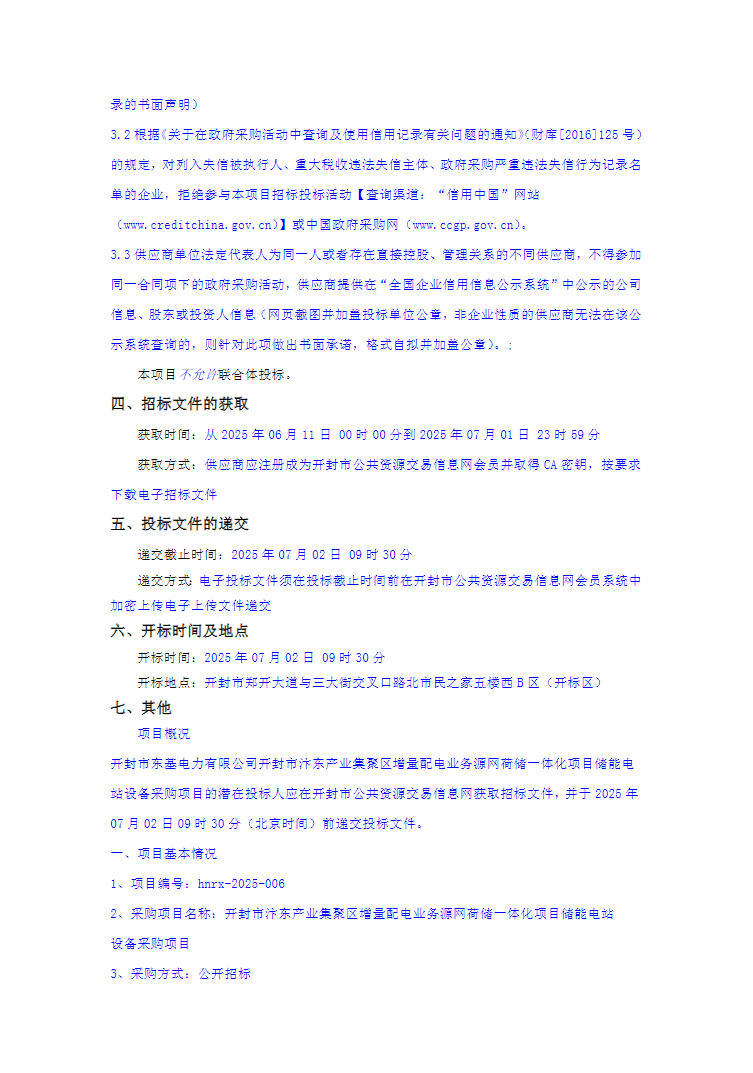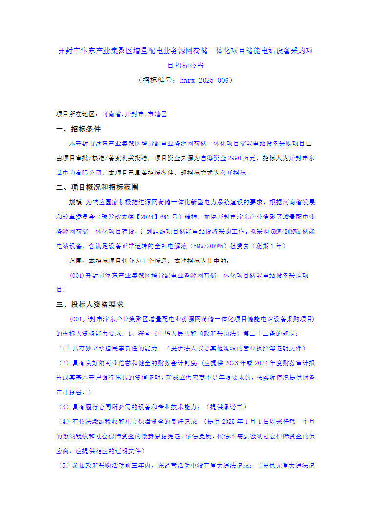 6月10日,开封市汴东产业集聚区增量配电业务源网荷储一体化项目储能电站设备采购项目招标公告发布。