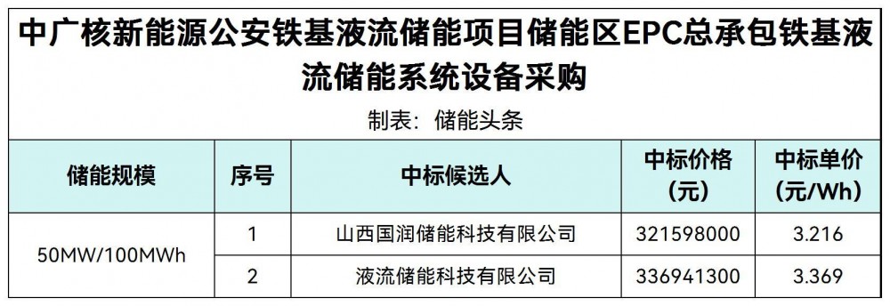 第一中标候选人为山西国润储能科技有限公司,投标报价32159.8万元,折合单价3.216元/Wh;第二中标候选人为液流储能科技有限公司,投标报价33694.13万元,折合单价3.369元/Wh。
