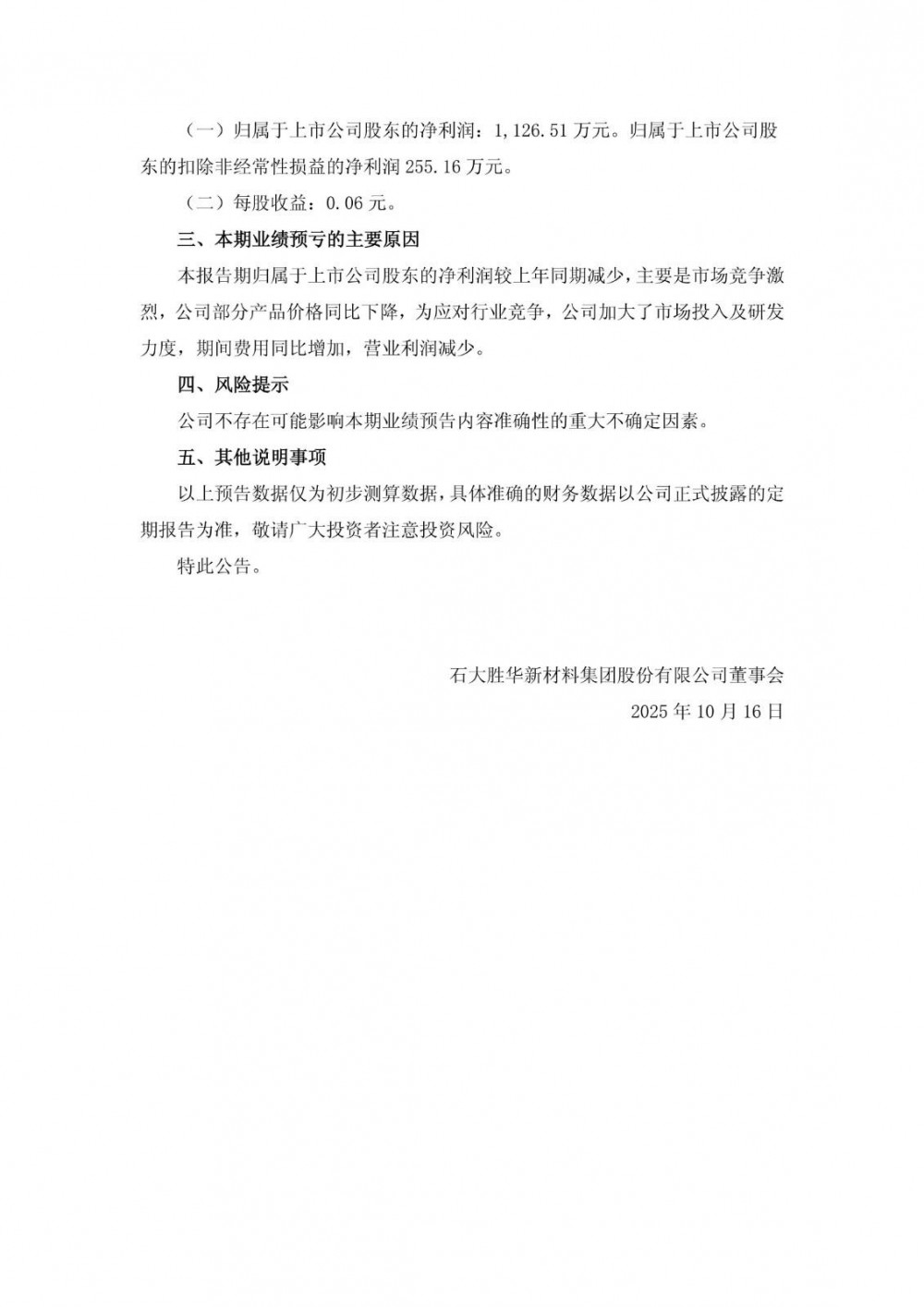 10月15日,石大胜华发布公告称,预计2025年前三季度实现归属于上市公司股东的净利润-4,900.00万元到-7,500.00万元,与上年同期(法定披露数据)相比,将减少6,026.51万元到8,626.51万元,同比减少534.97%到765.77%。扣除非经常性损益事项后,预计2025年前三季度归属于上市公司股东的扣除非经常性损益的净利润-5,300.00万元到-7,900.00万元,与上年同期(法定披露数据)相比,将减少5,555.16万元到8,155.16万元,同比减少2,177.13%到3,196.10%。