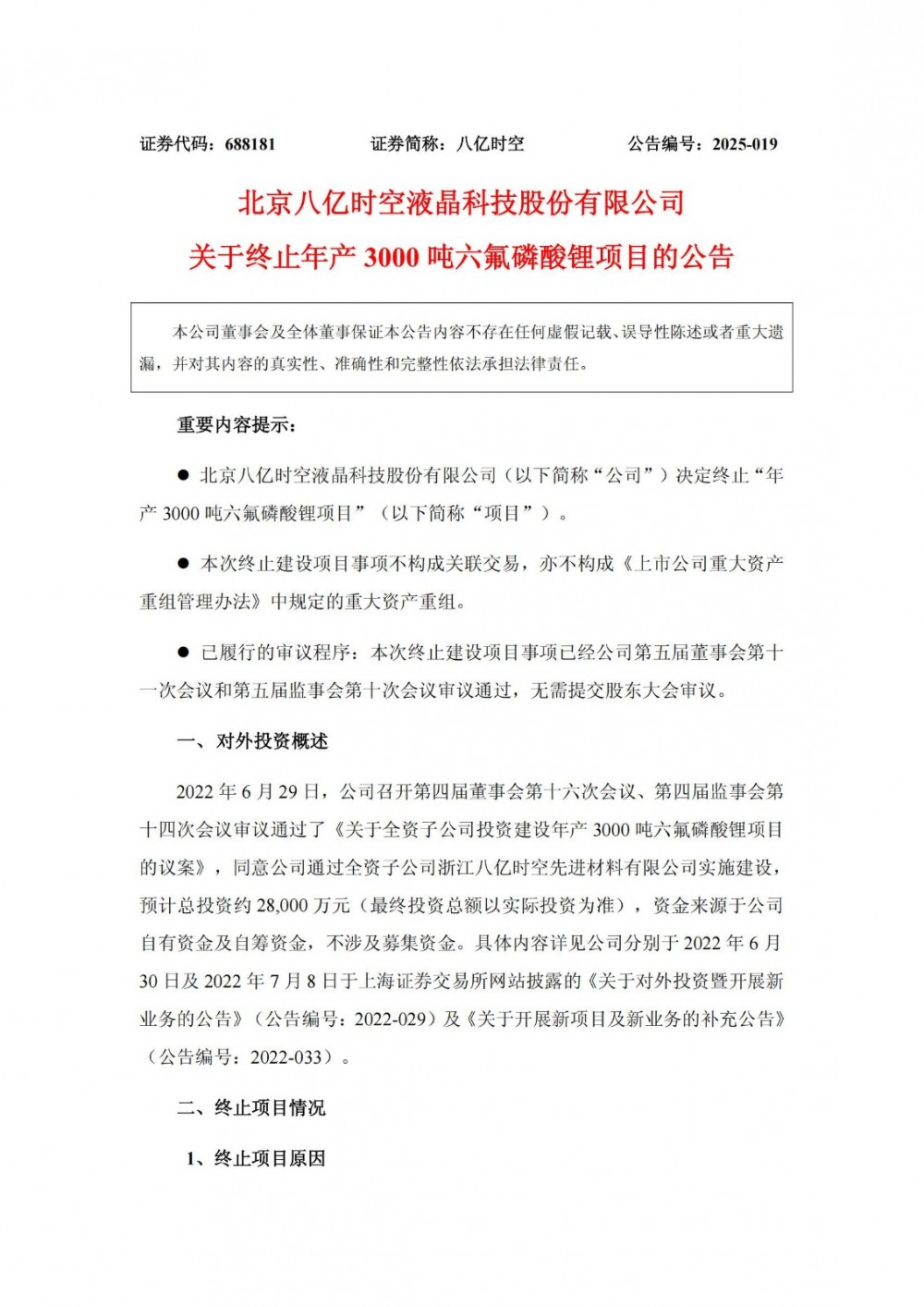 4月25日,八亿时空发布公告称,公司决定终止“年产3000吨六氟磷酸锂项目”。