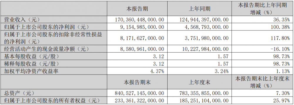 财报数据显示,一季度,比亚迪实现营收1730.6亿元,同比增长36.35%;归属上市公司股东净利润91.55亿元,同比增长100.38%。