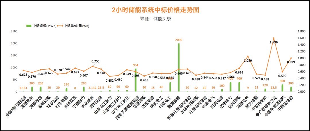 2h储能系统项目中标低价Top1为0.452元/Wh,由山东电工时代报出;第二为0.463元/Wh,由思源清能报出;第三为0.48元/Wh,投标企业为山东电工时代。