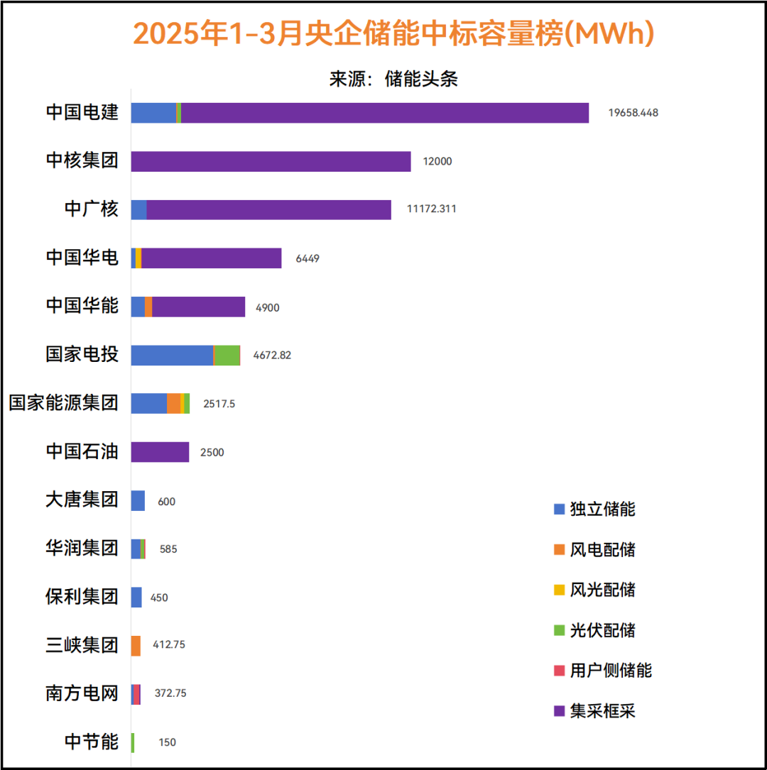 1-3月开标规模超100MW的央企有中国电建、中核集团、中广核、中国华电、中国华能、国家电投、国家能源集团、中国石油、大唐、华润等。其中:中国电建:开标规模19658.448MWh;中核集团:开标规模12000MWh;中广核:开标规模11172.311MWh;中国华电:开标规模6449MWh;中国华能:开标规模4900MWh;国家电投:开标规模4672.82MWh;国家能源集团:开标规模2517.5MWh;中国石油:开标规模2500MWh;大唐集团:开标规模600MWh;华润集团:开标规模585MWh;保利集团:开标规模450MWh;三峡集团:开标规模412.75MWh;南方电网:开标规模372.75MWh;中节能:开标规模150MWh。