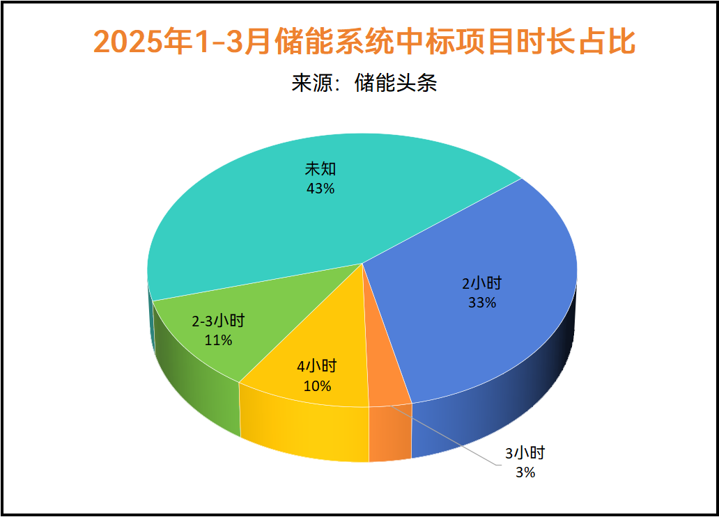 从储能时长来看,据统计,2025年1-3月储能系统采购项目中,2小时储能系统共涉8011.333MWh,占比约为33%;4小时储能系统共涉及2393MWh,占比10%;2-3小时储能时长共2787.96MWh,占比约为11%。