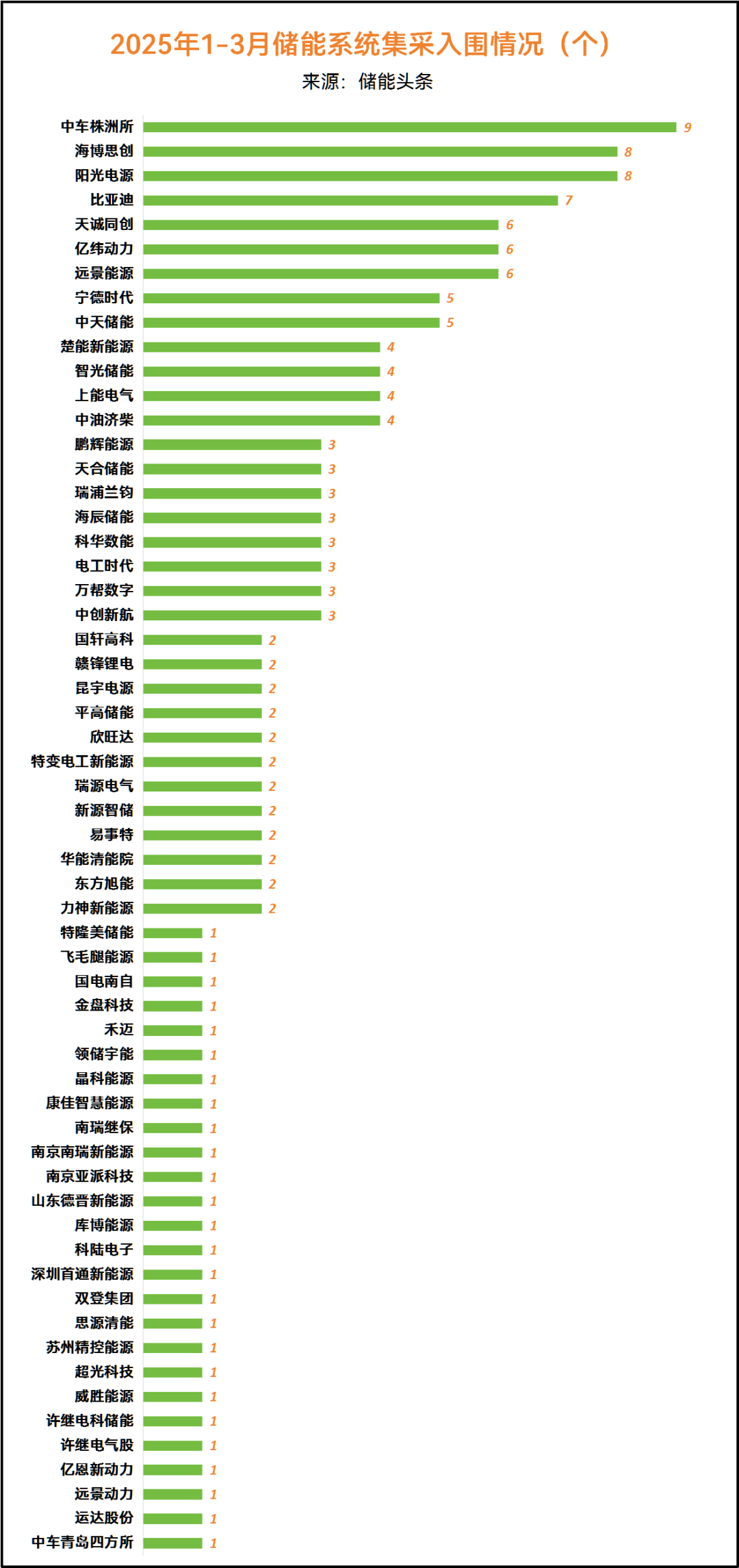 在2025年1-3月已开标的储能系统集采中,共有59家企业中标。其中,中车株洲所获最丰,中标数量达到9个,阳光电源、海博思创中标数量均达到8个,比亚迪中标7个。