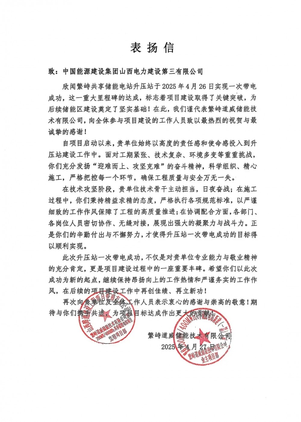 4月26日,繁峙共享储能电站项目升压站一次带电成功,标志着该项目朝着全面投产又迈出了坚实的一步,为后续工作的顺利开展奠定了基础。