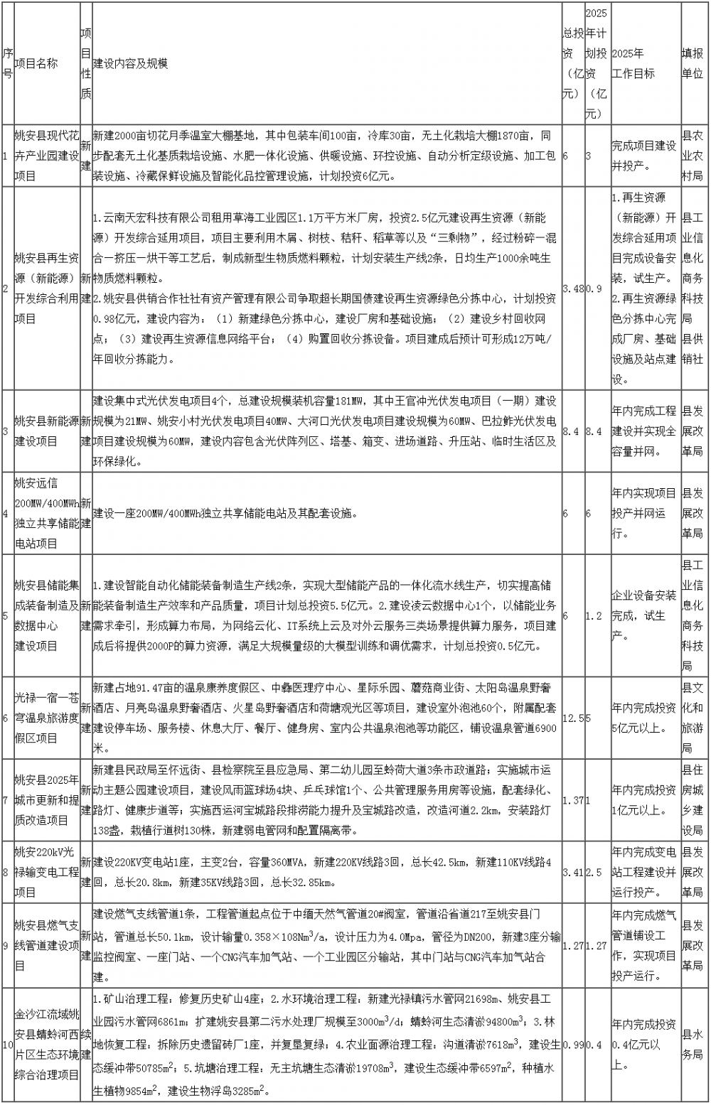 文件提出,2025年姚安县将围绕储能系统装备制造、自动化生产线、集中式共享储能电站等新型储能产业三个板块项目,进一步深化与深圳远信合作,加快推进远信200MW/400MWh独立共享储能电站、新锐储能智能生产线、致信分散式风力发电等项目建设,力争姚安远信产值突破20亿元。强化要素保障和跟踪服务,加速推进220KV光禄变电站、再生资源绿色分拣中心、再生资源(新能源)开发综合利用、两轮车共享换电等能源项目,推动重点工业实现量的提升和质的突破。