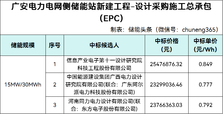 中标候选人第1名为信息产业电子第十一设计研究院科技工程股份有限公司,投标报价为25476876.32元,折合单价0.849元/Wh;中标候选人第2名为中国能源建设集团广西电力设计研究院有限公司(联合:广东阿尔派电力科技股份有限公司),投标报价为23299036.46元,折合单价0.777元/Wh;中标候选人第3名为河南同力电力设计有限公司(联合:东方电子股份有限公司),投标报价为23766363.03元,折合单价0.792元/Wh。