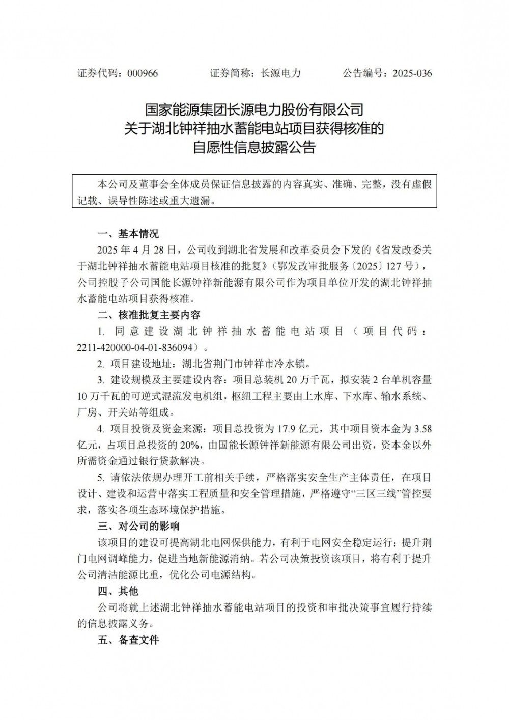 4月29日,长源电力发布公告称,公司收到湖北省发展和改革委员会下发的《省发改委关于湖北钟祥抽水蓄能电站项目核准的批复》,