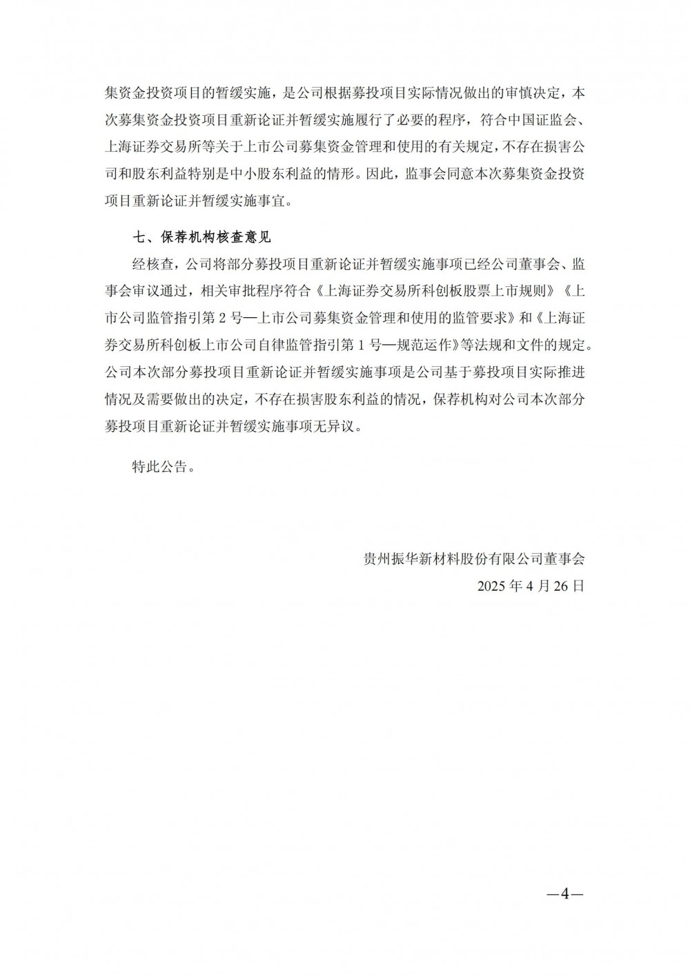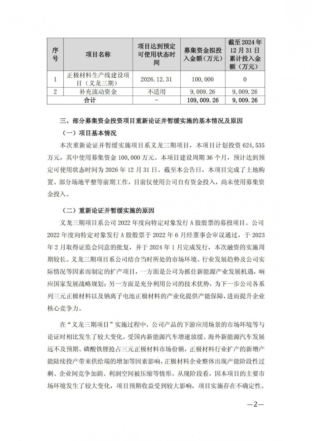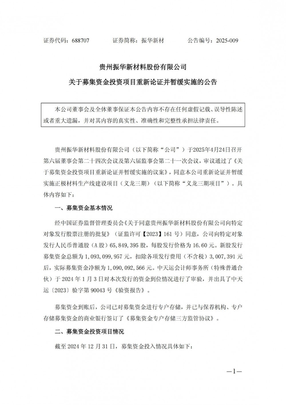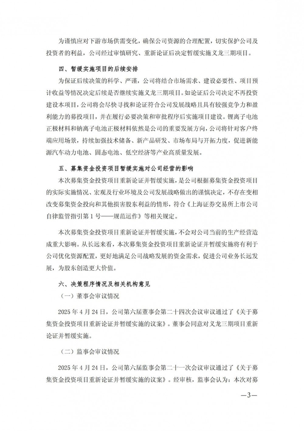 4月25日,振华新材发布公告称,公司于2025年4月24日召开董事会和监事会,审议通过了《关于募集资金投资项目重新论证并暂缓实施的议案》。根据该议案,公司将暂缓实施正极材料生产线建设项目(义龙三期)。